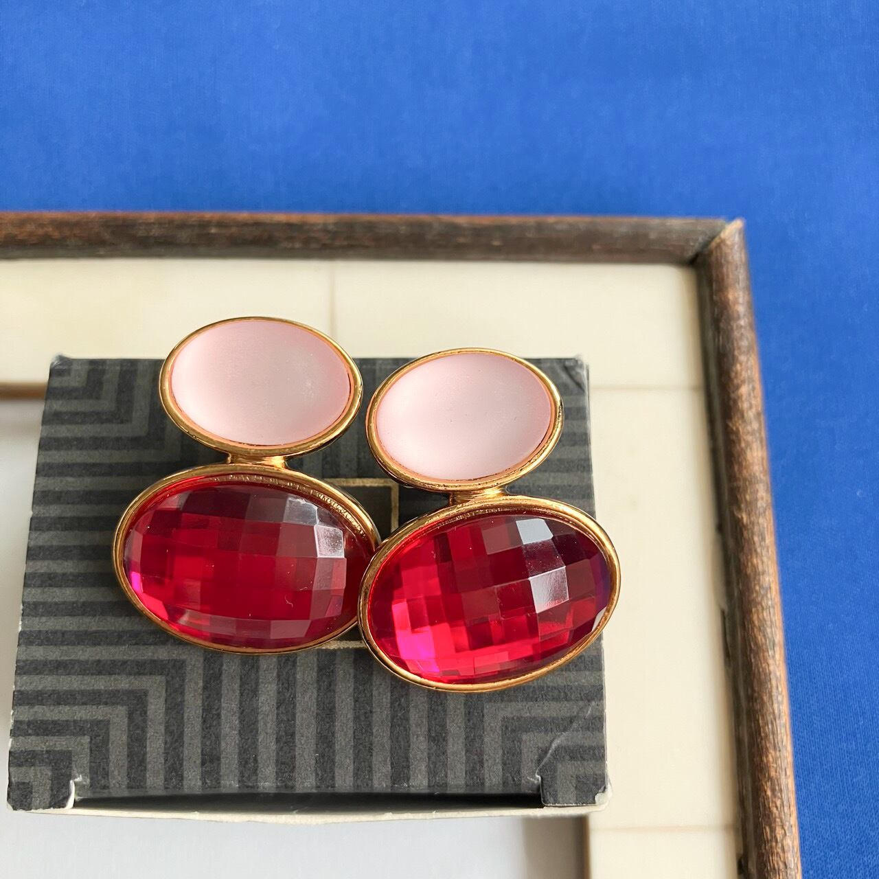 ゴールドメタルの土台に、フロストピンクと落ち着いた濃いピンクの大粒のカボションで印象的にデザインされた、とても素敵な”AVON”(エイボン)のヴィンテージピアスです。