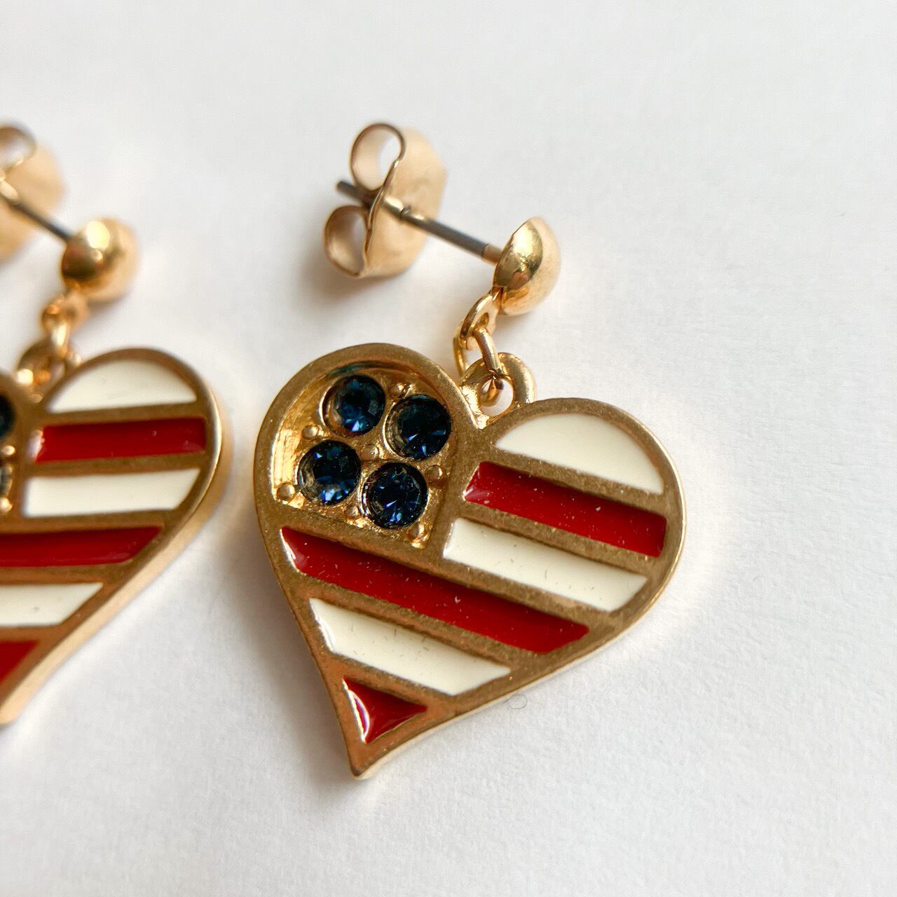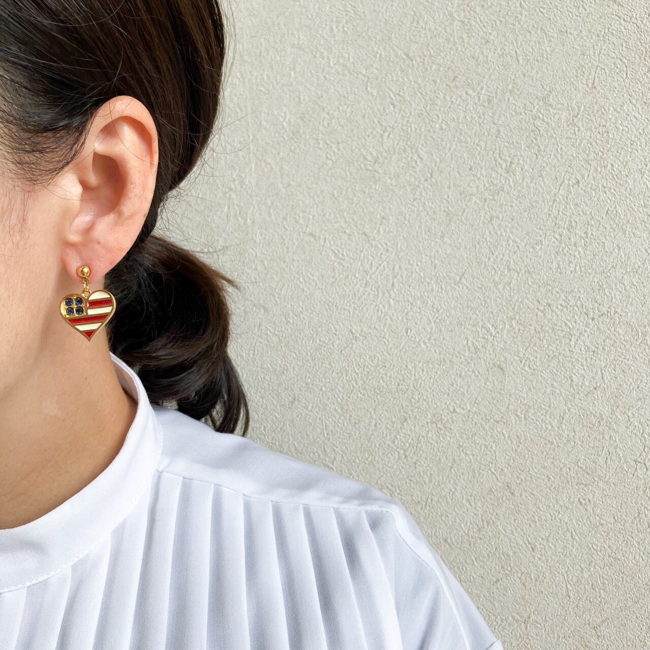ゴールドメタルの土台に、ブルーラインストーンとレッド&ホワイトエナメルでアメリカの星条旗がデザインされたハート型の揺れるパーツが、とても素敵な”AVON”(エイボン)のヴィンテージピアスです。