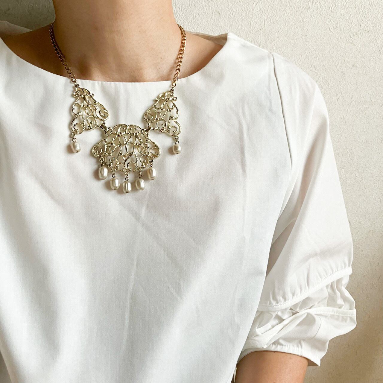 1949年に設立されたジュエリーメーカー”Sarah Coventry”(サラコベントリー )の、ゴールドメタルの装飾的なレースのようなモチーフにパールビーズが揺れる、美しくデザインされたとても素敵なヴィンテージネックレスです。