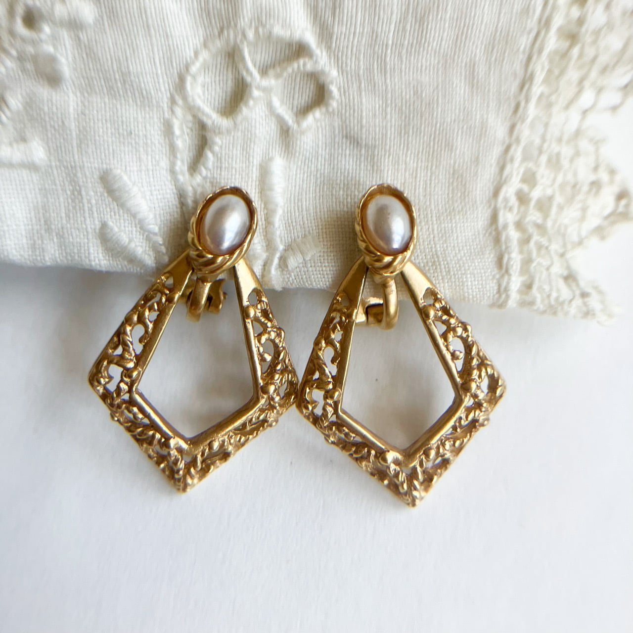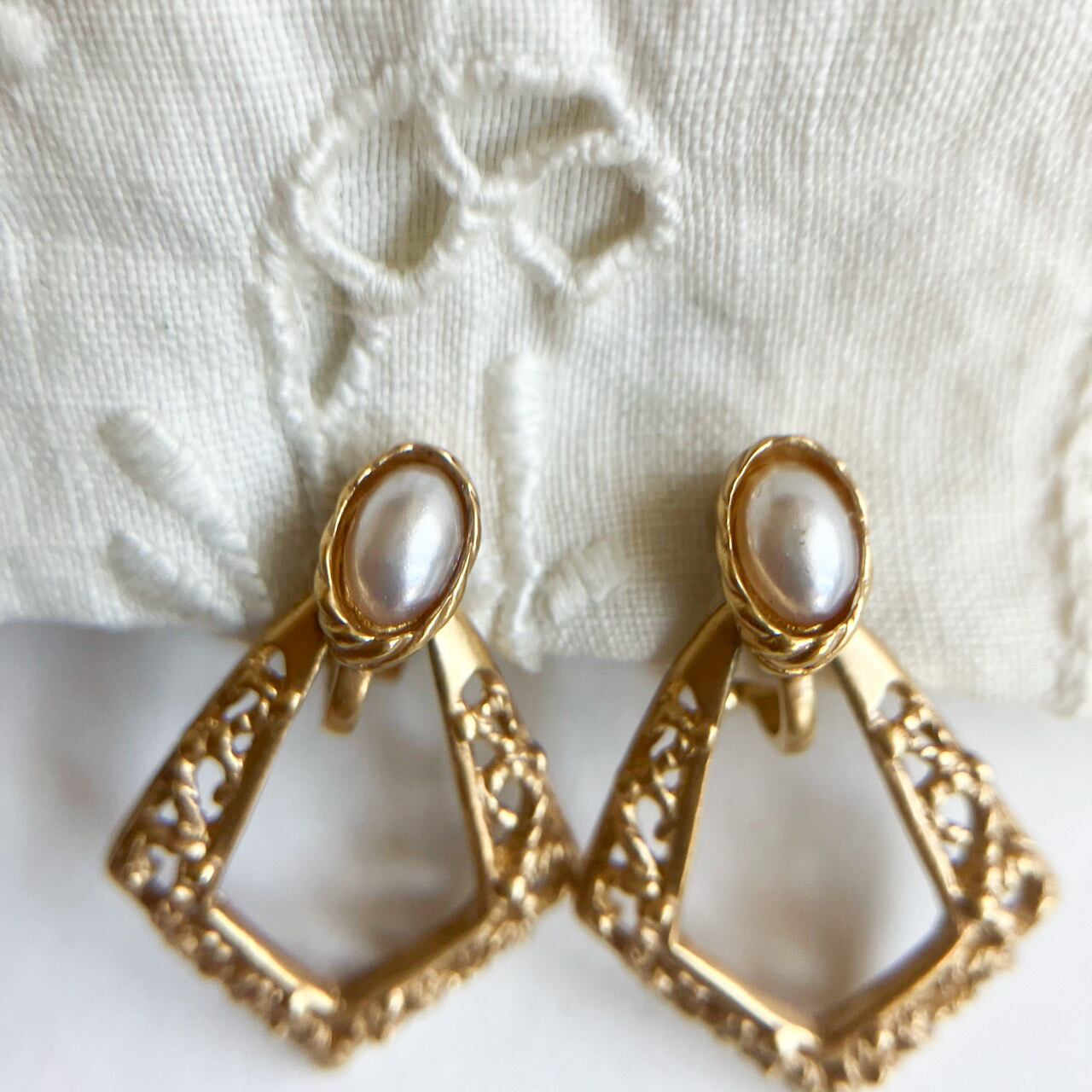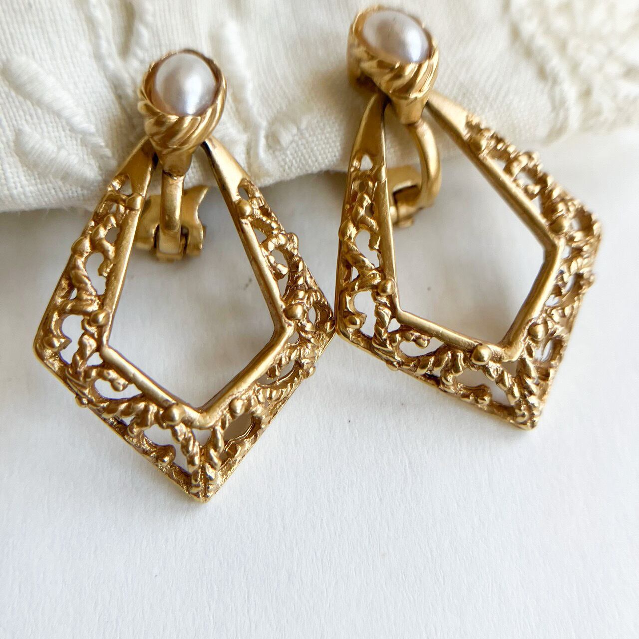 マットなゴールドメタルの装飾的なモチーフと、トップに小粒のパールがデザインされた、とても素敵なヴィンテージイヤリングです。