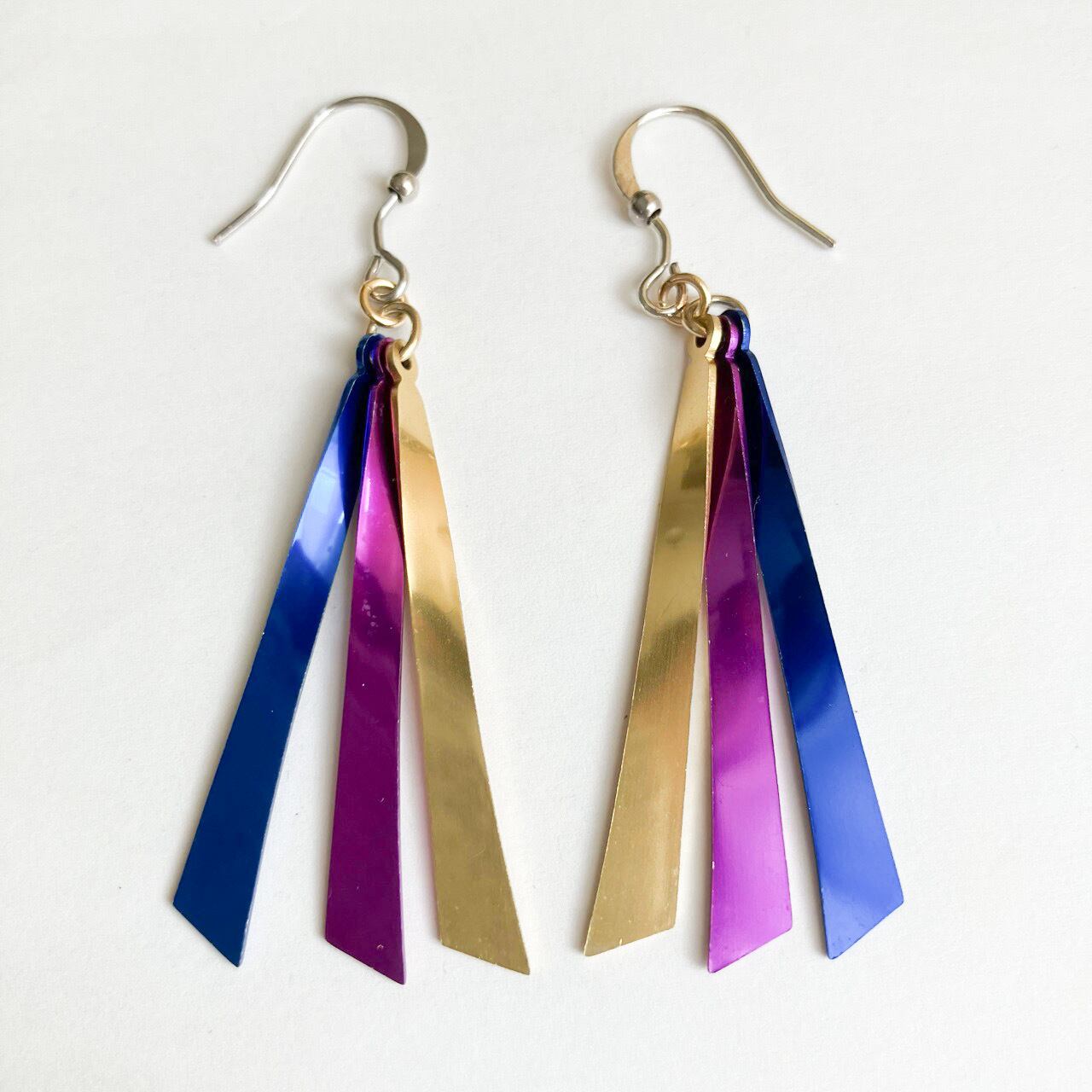 金、紫、青のメタルでデザインされたリボンのようなパーツが揺れる、洗練されたクールなデザインが、とても素敵な”AVON”(エイボン)のヴィンテージピアスです。