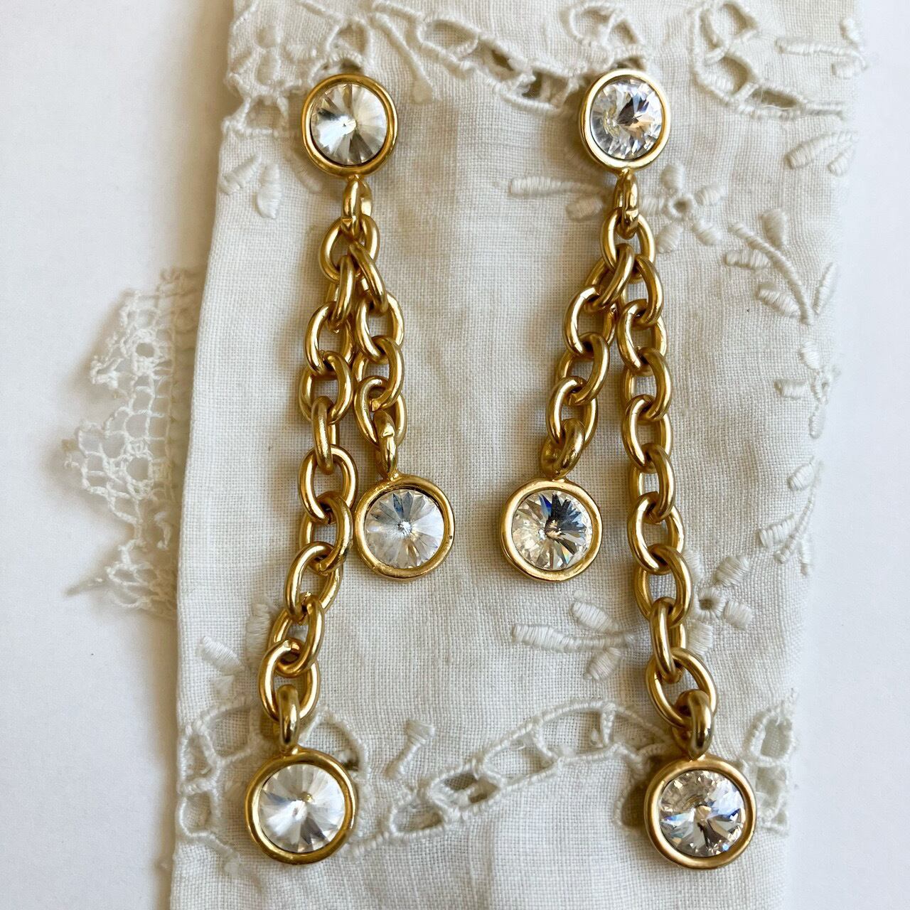 明るいマットなゴールドメタルの太めのチェーンに、大粒のクリアラインストーンが揺れるデザインが、存在感がありとても素敵なヴィンテージピアスです。