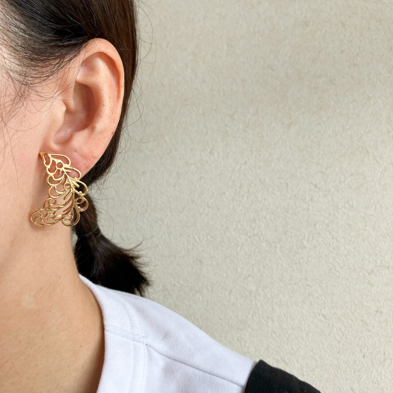 ゴールドメタルの軽やかな透かし柄の羽根のようなデザインが、とても素敵なヴィンテージピアスです。