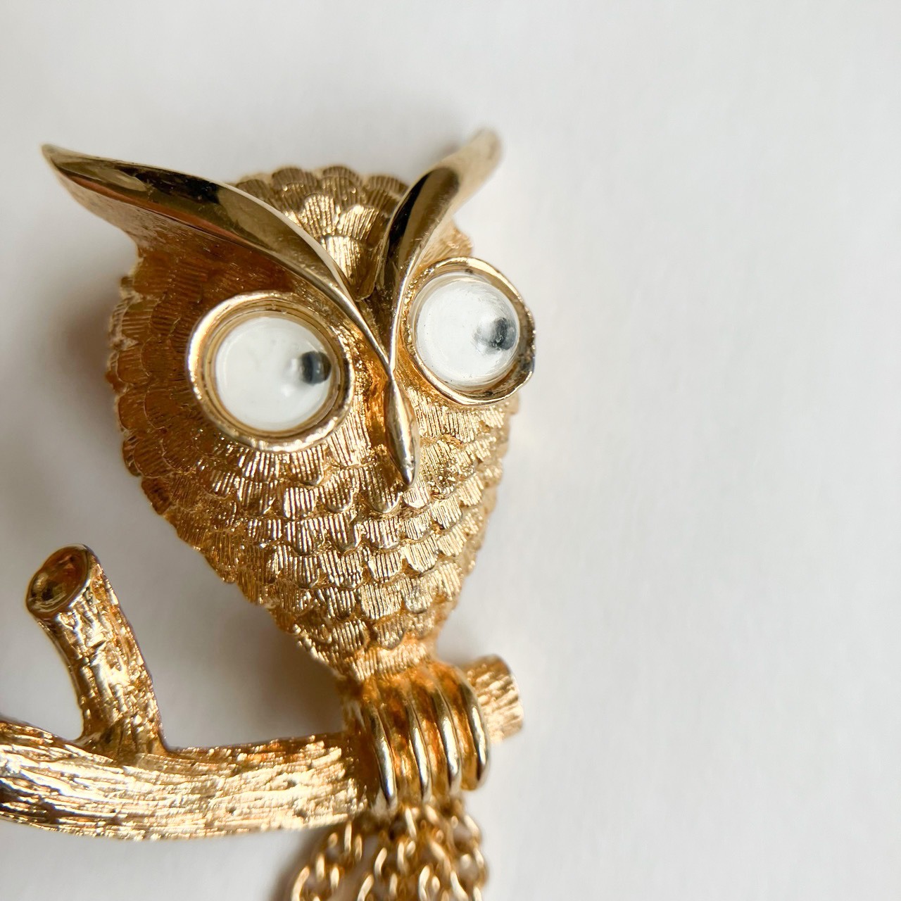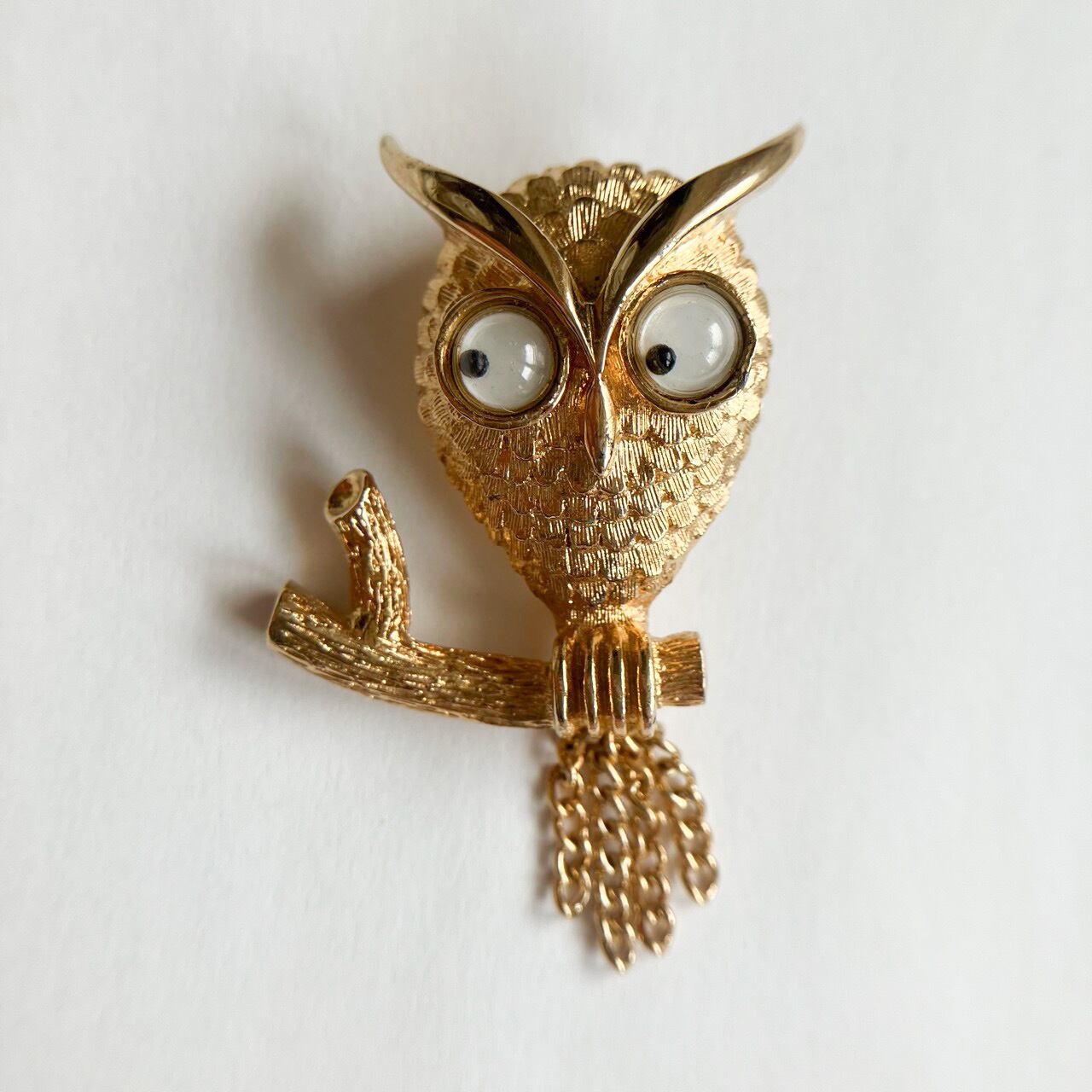 黒目が動くユニークなゴールドメタルのフクロウのデザインが、とても素敵な”AVON”(エイボン)のヴィンテージブローチです。