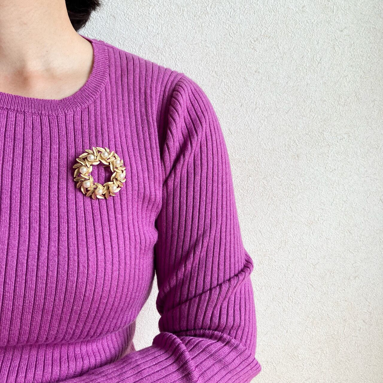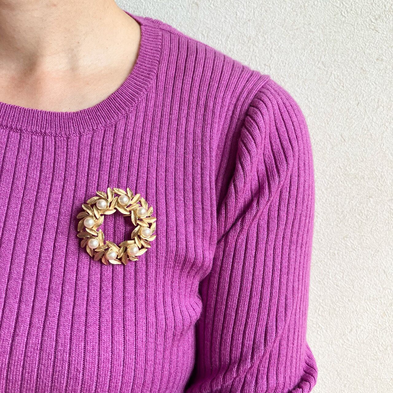 加工されたゴールドメタルにパールビーズの、上品なリースのデザインが、とても素敵な”AVON”(エイボン)のヴィンテージブローチです。