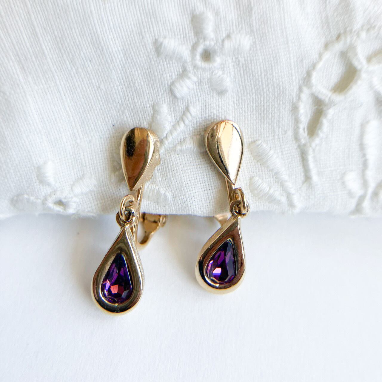 ゴールドメタルの土台に、落ち着いたパープルのティアドロップ型ラインストーンがセットされて揺れるデザインが、とても素敵な”AVON”(エイボン)のヴィンテージイヤリングです。