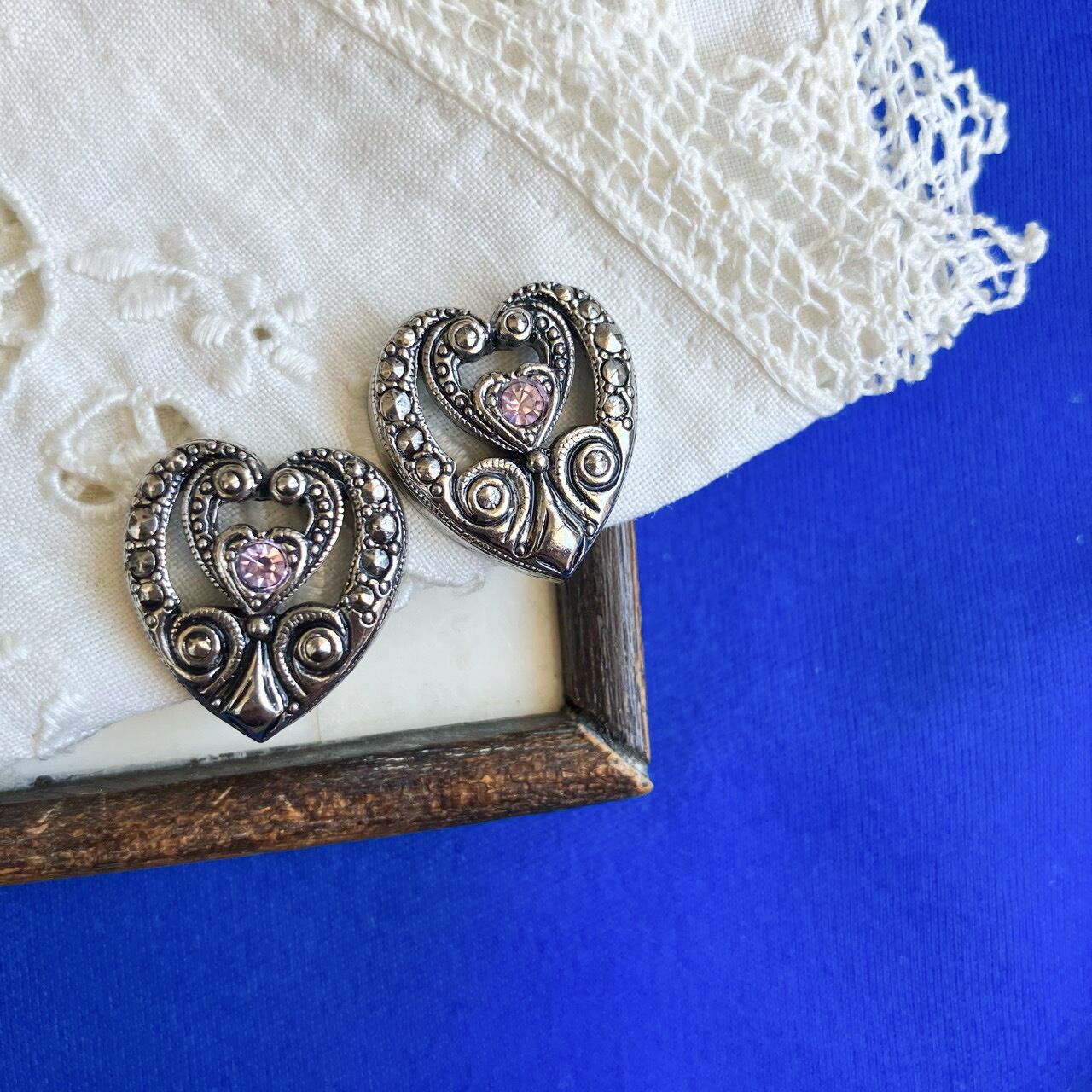 アンティーク調シルバーメタルに、マーカサイト風パーツと淡いピンクのラインストーンがさりげないアクセントになったハートのデザインが、とても素敵な”AVON”(エイボン)のヴィンテージイヤリングです。