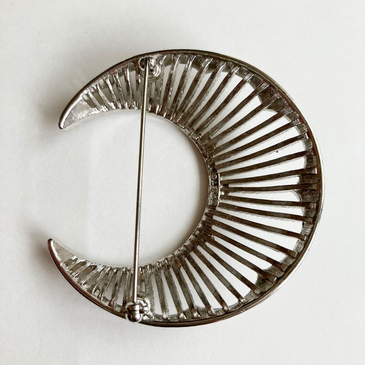 1937年に設立された、メタルを使ったモダンなデザインで人気のジュエリーメーカー"Monet"(モネ)の、シルバーメタルのモダンな透かし柄のお洒落な三日月のデザインが、とても素敵なヴィンテージブローチです。