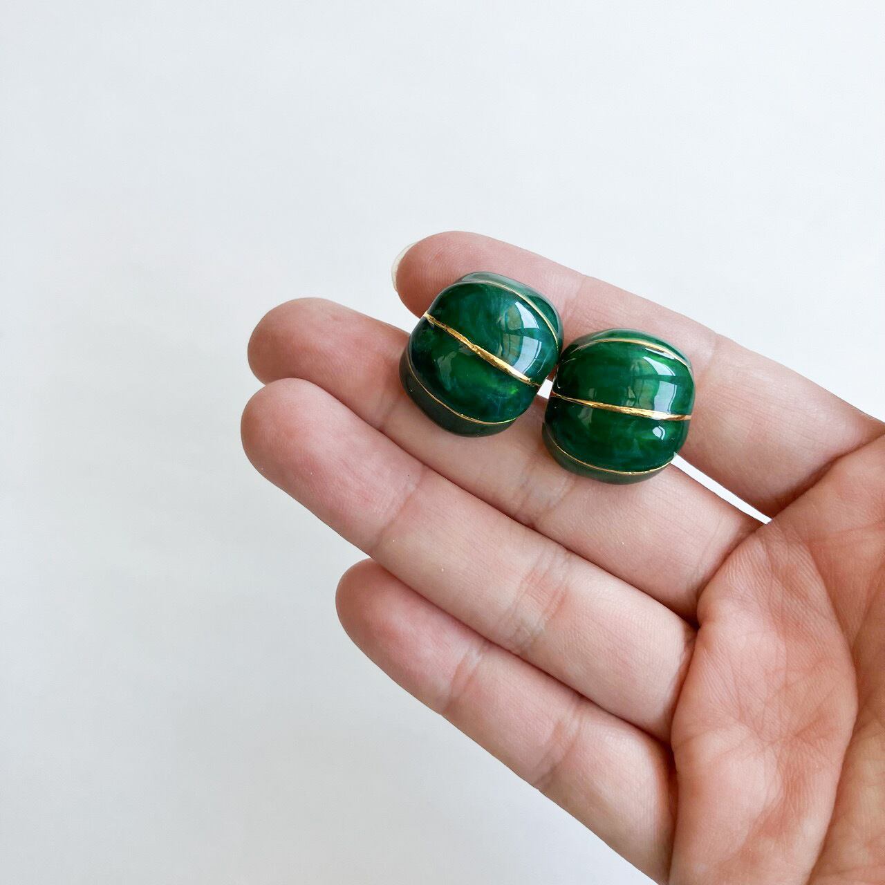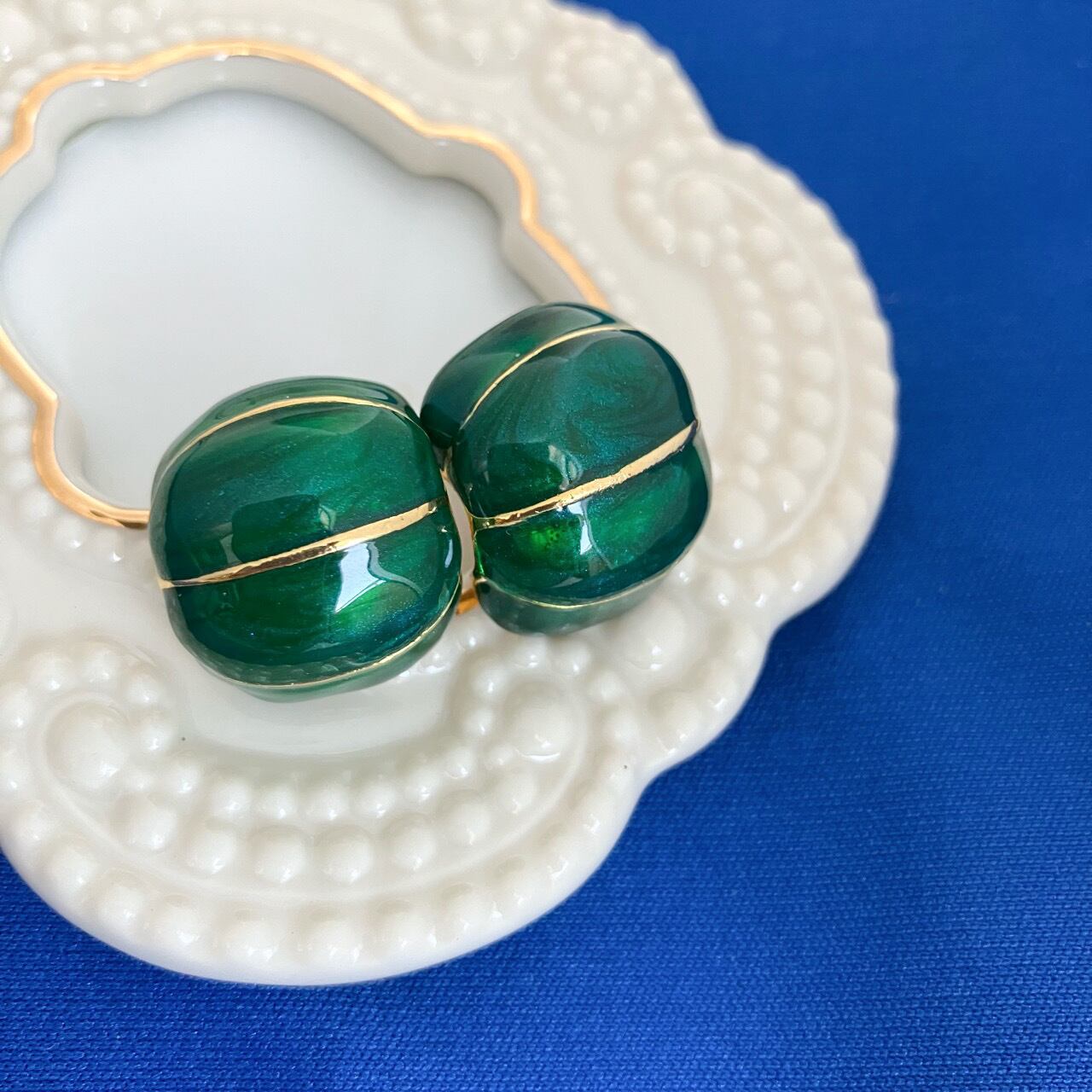 ゴールドメタルのベースに、きれいなグリーン系エナメルの丸みのある美しいデザインが、とても素敵なヴィンテージイヤリングです。