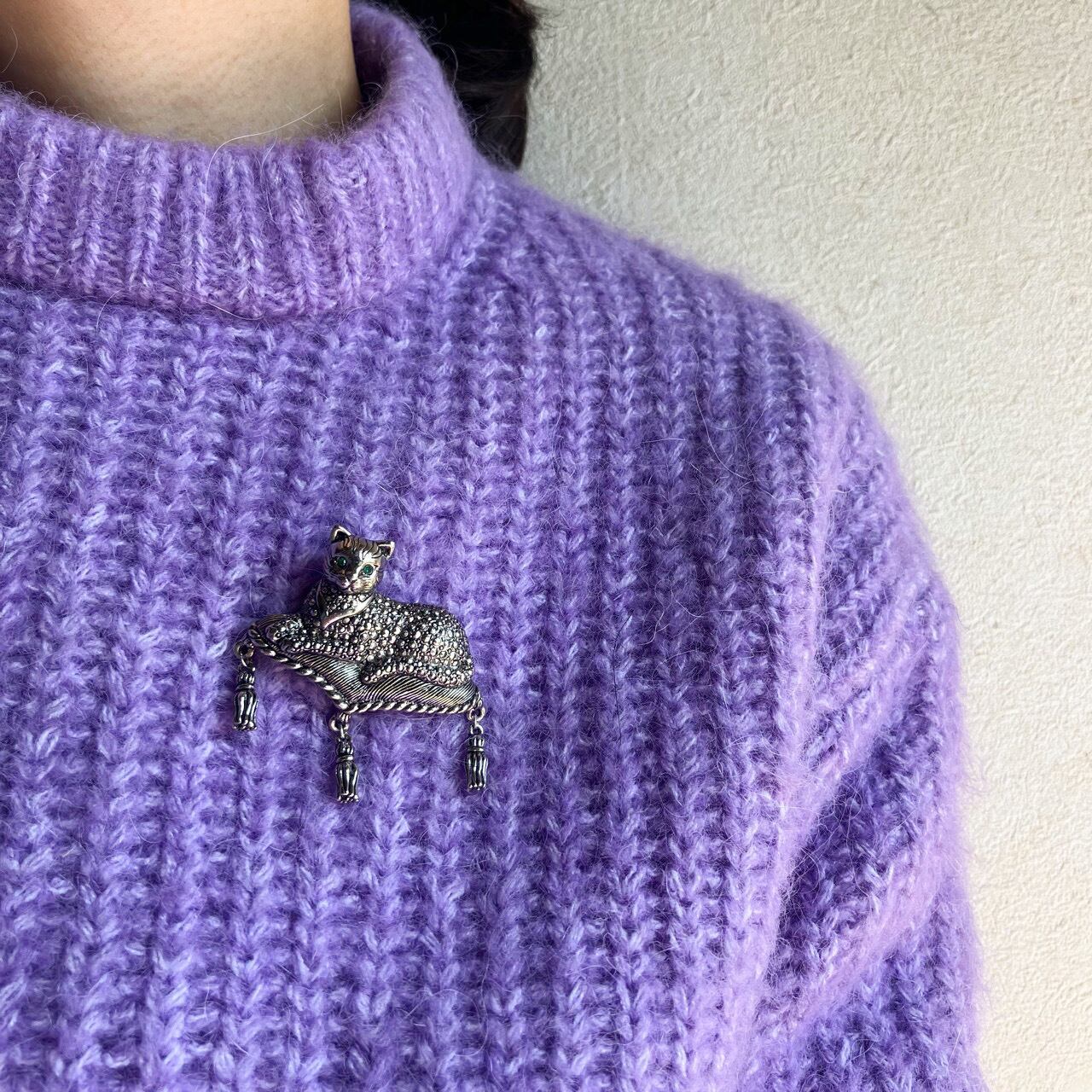 アンティーク調の渋みのあるシルバーメタルにマーカサイト風パーツで飾られた、グリーンの目の猫がクッションに座っているデザインが、とても素敵な”AVON”(エイボン)のヴィンテージブローチです。