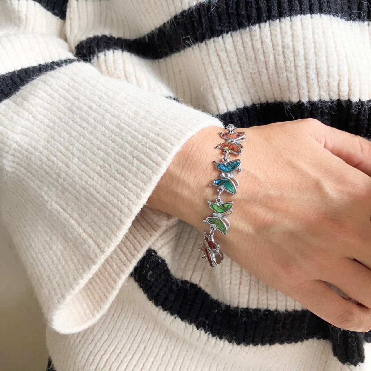 シルバーメタルの土台にアヴァロンシェルでカラフルな蝶々がデザインされた、とても素敵なヴィンテージブレスレットです。