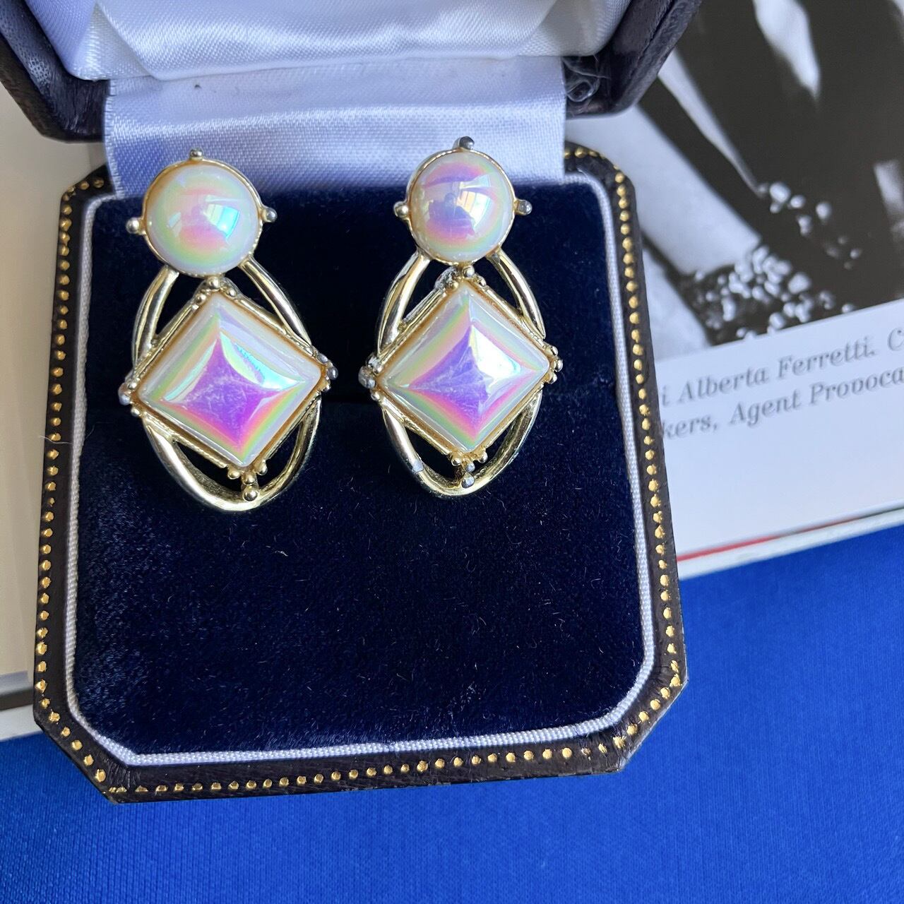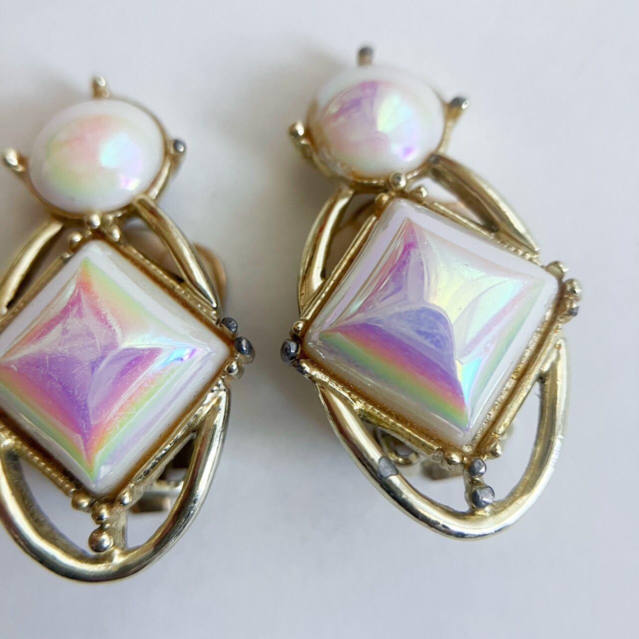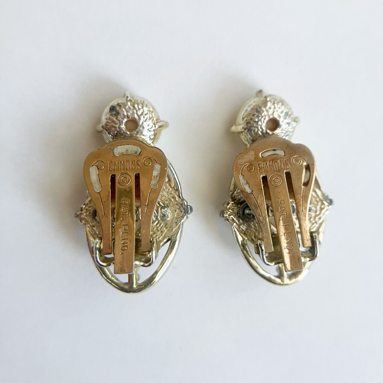 1948年に設立された“Sarah Coventry”の姉妹ブランド“EMMONS”の、ゴールドメタルのデザインされた土台に、きれいなオーロラの輝きがあるホワイトのダイヤとラウンドカボションが、とてもスペシャルで素敵なヴィンテージイヤリングです。