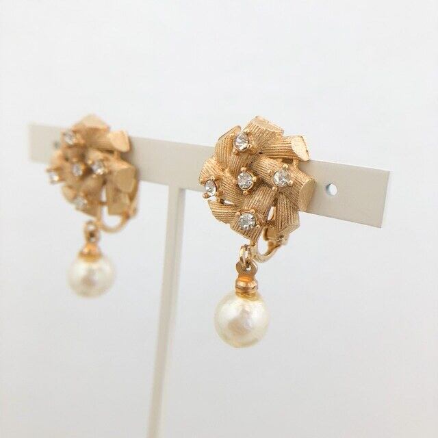 加工されたゴールドメタルとクリアラインストーンでデザインされたトップに、パールビーズが揺れるデザインが、とても素敵なヴィンテージイヤリングです。