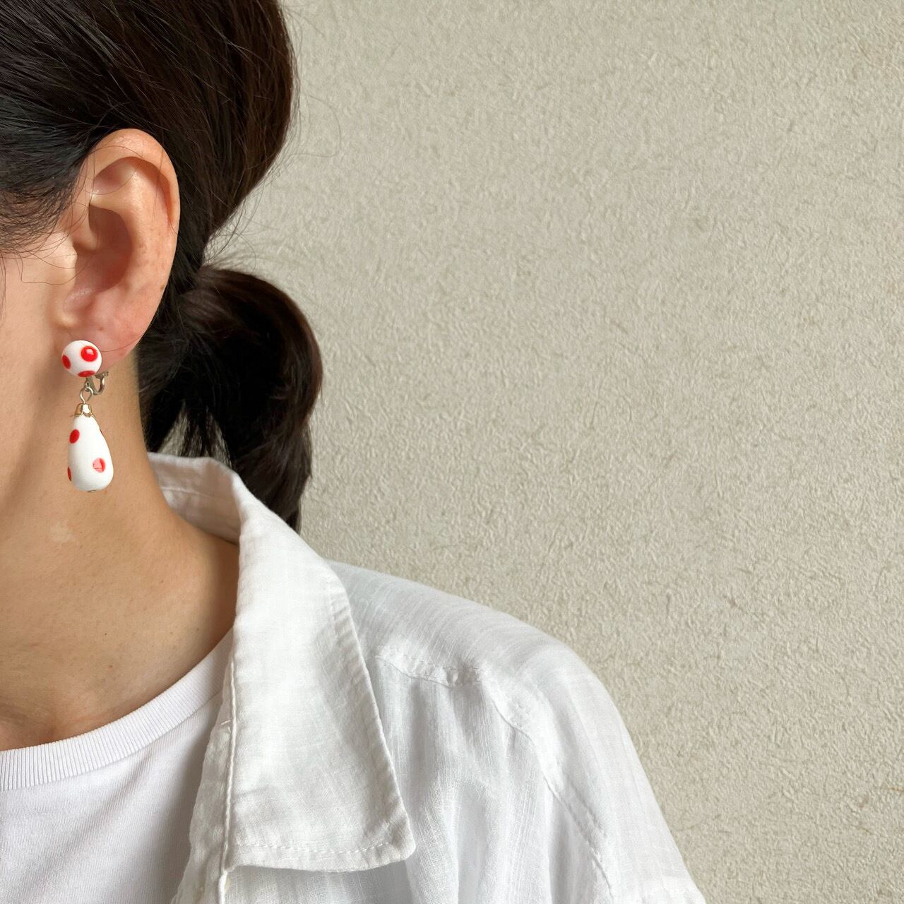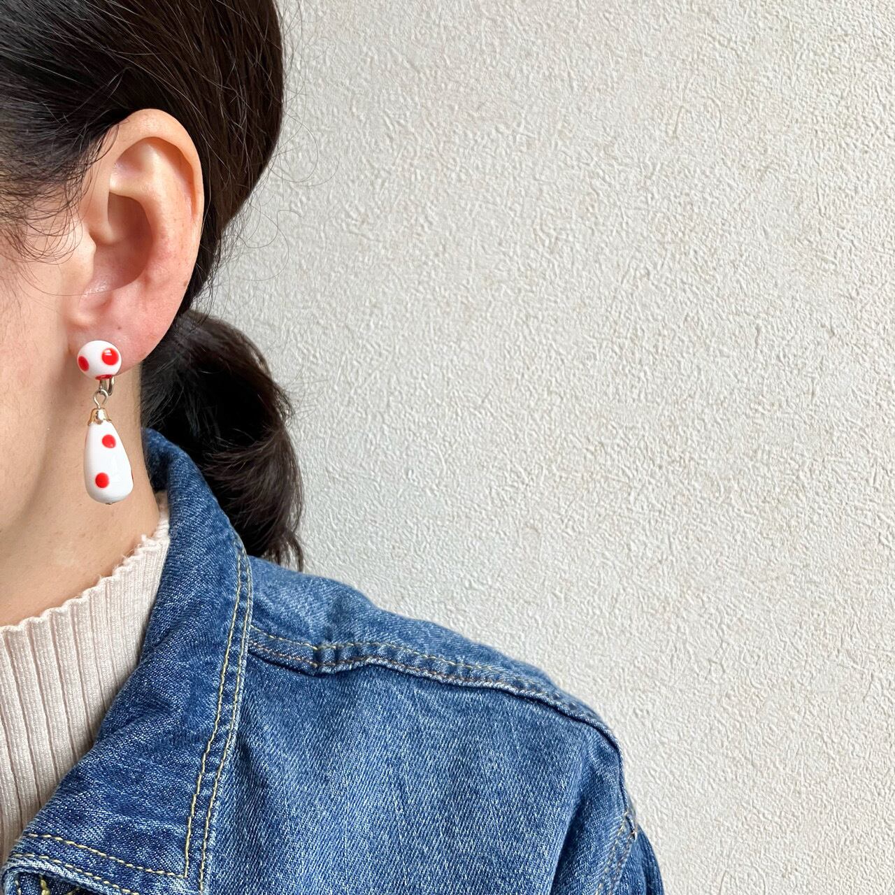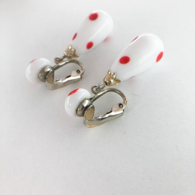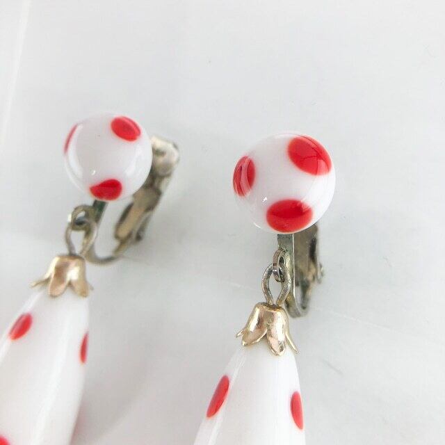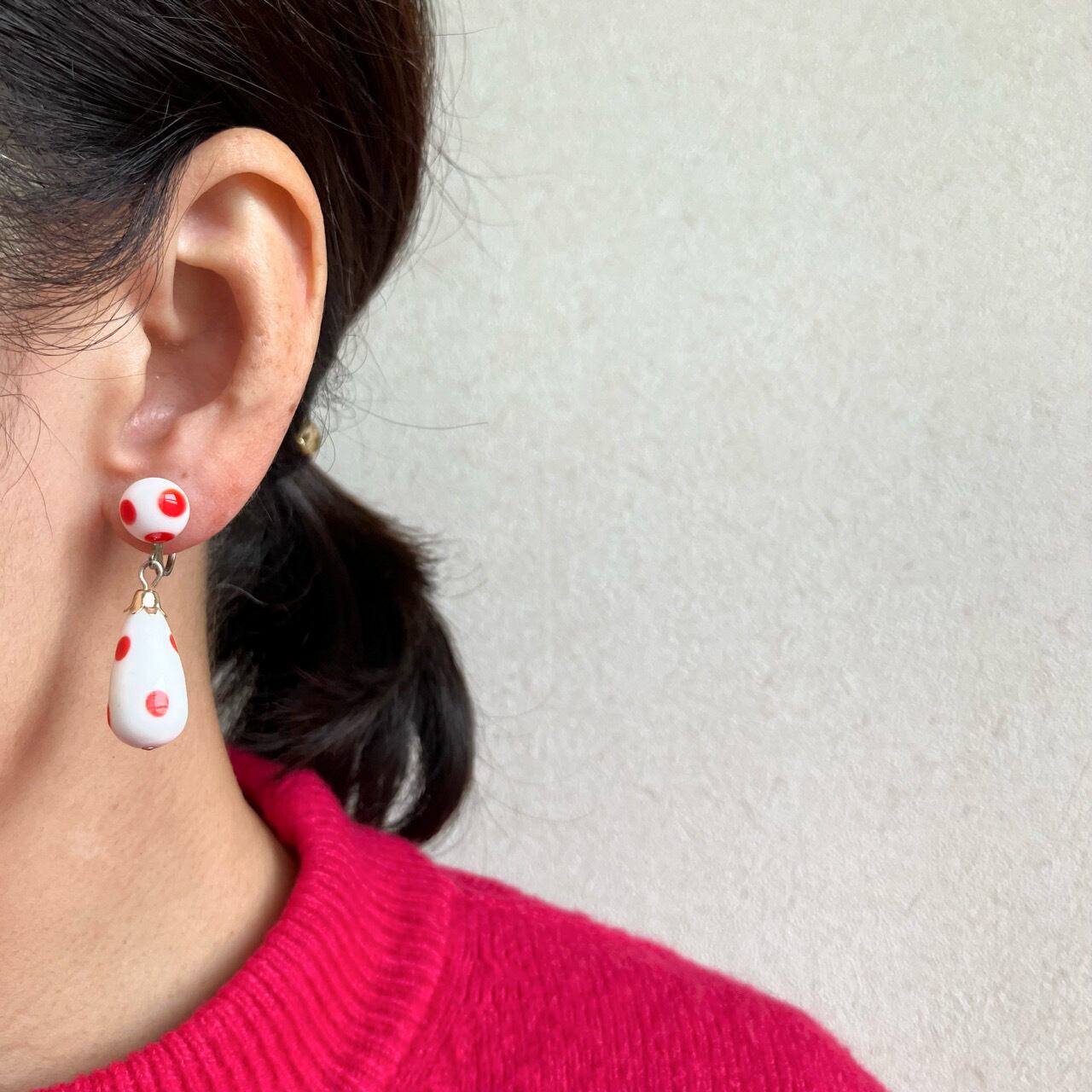 ホワイトベースにレッドの水玉ドットデザインが、とても素敵な揺れるヴィンテージイヤリングです。