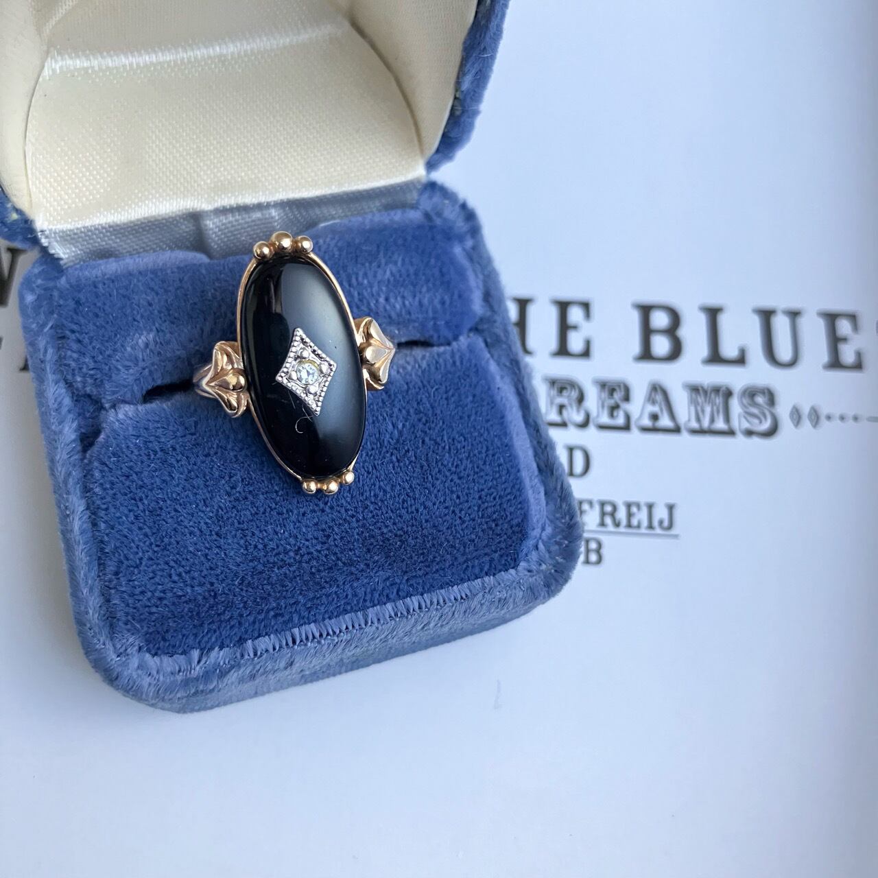 ゴールドメタルの土台にオニキス風ブラックカボション、シルバーメタルとラインストーンのダイヤ型のヴィクトリアン調デザインが、とても素敵な、”AVON”(エイボン)のヴィンテージリングです。