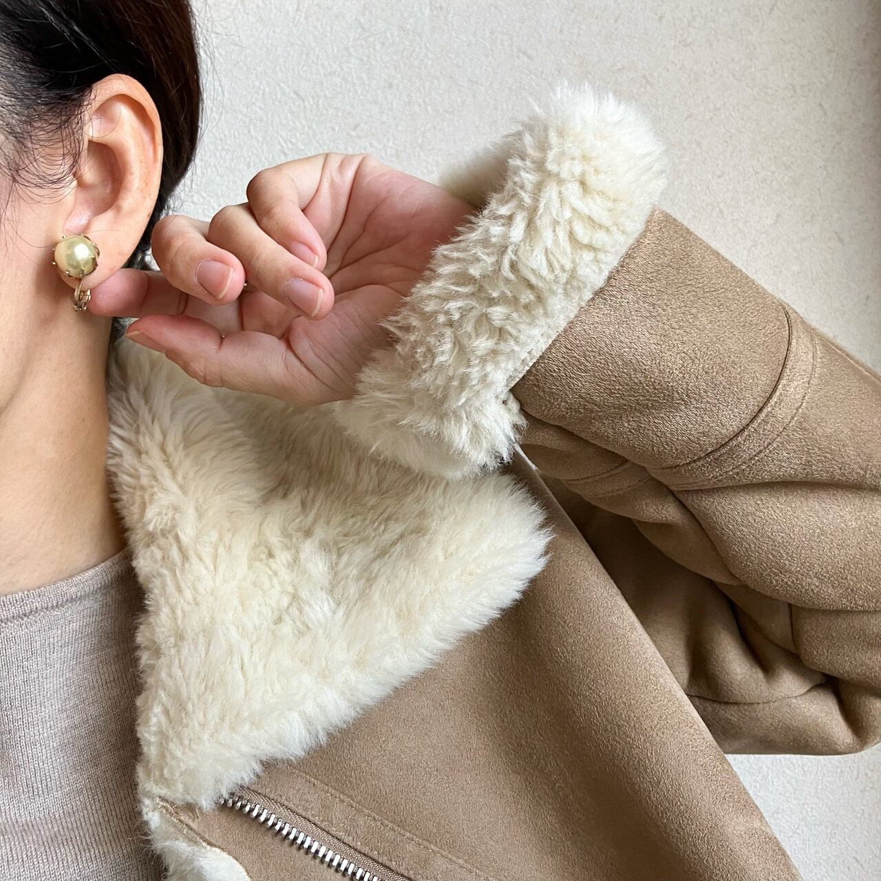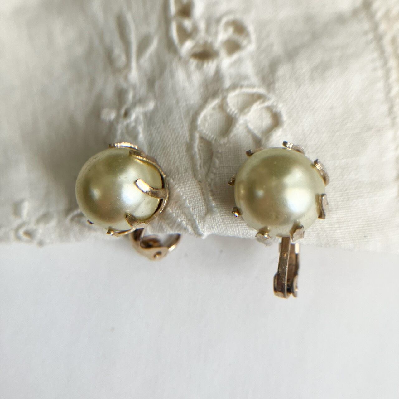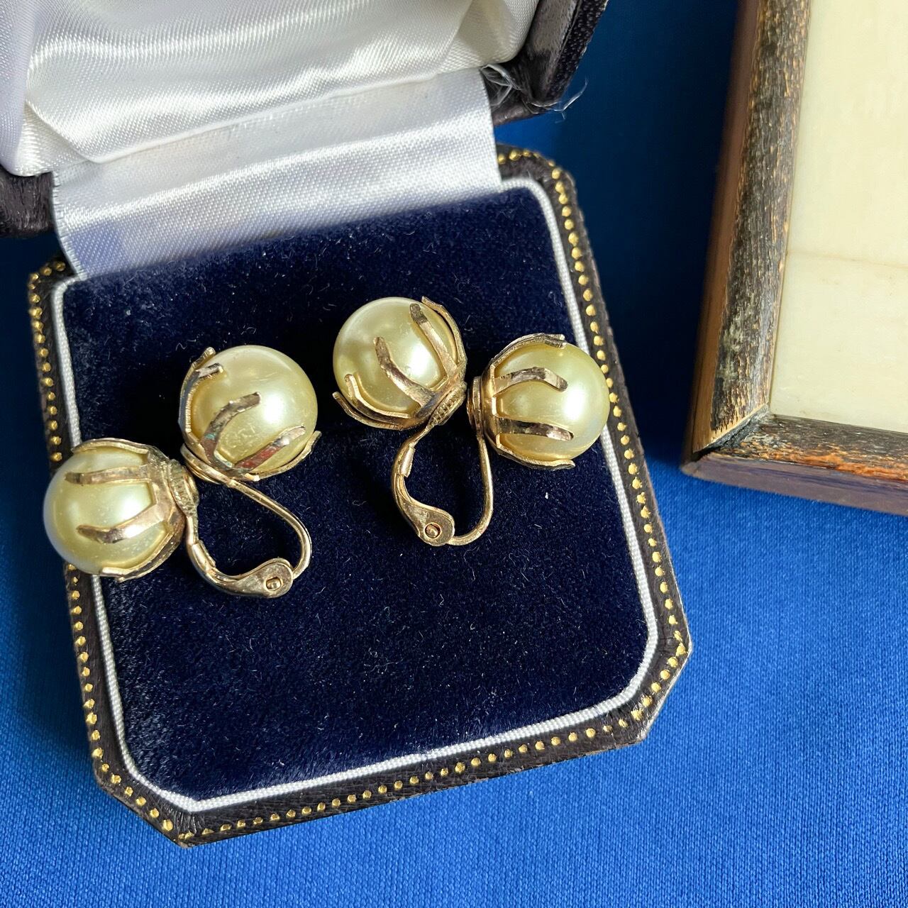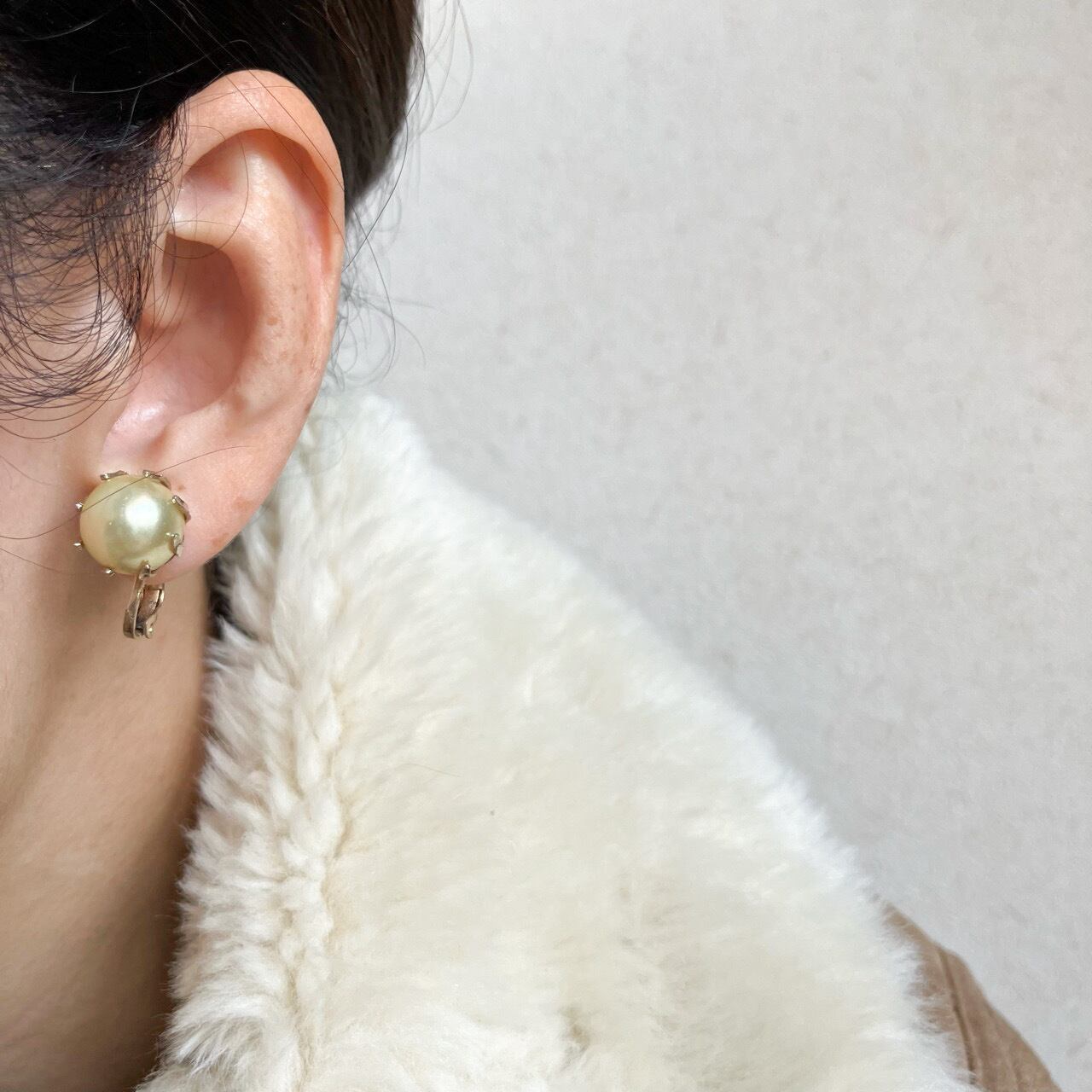やや黄色味が入ったような色が濃い大粒のクリーム色パールビーズが、耳を挟むように前後に2粒ついたユニークなデザインが、とてもお洒落ヴィンテージイヤリングです。