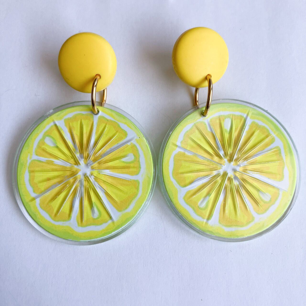 優しいイエローのトップに、クリアプラスティックでカバーされた大きなレモンスライスのユニークなデザインが、とても素敵な”AVON”(エイボン)のヴィンテージピアスです。