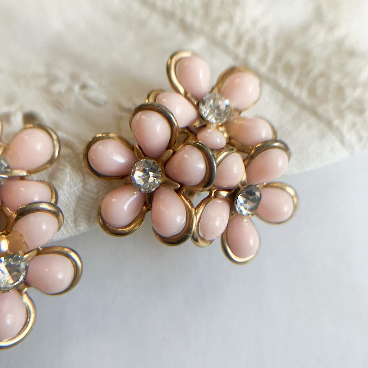 淡い優しいピンクにクリアラインストーンの3つのお花が集まった可憐なデザインが、とても素敵なヴィンテージイヤリングです。