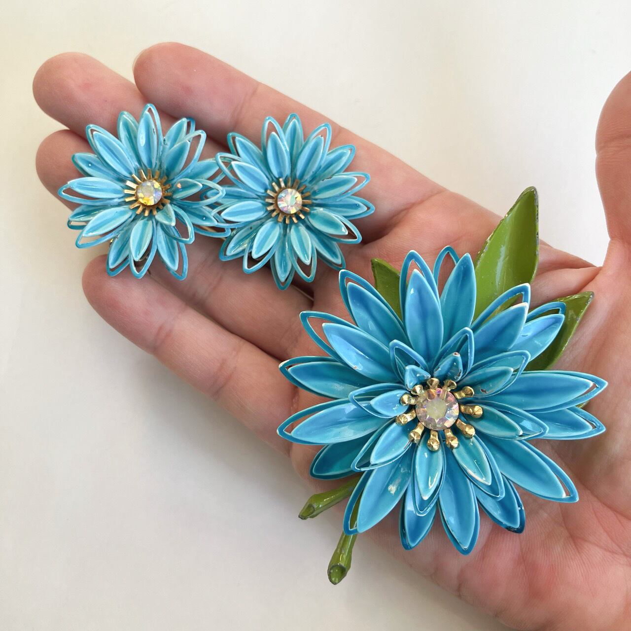 落ち着いたブルーエナメルにゴールドメタルの装飾やオーロララインストーンで飾られた、立体的な花びらが素敵なフラワーデザインが、とても素敵なヴィンテージイヤリングです。