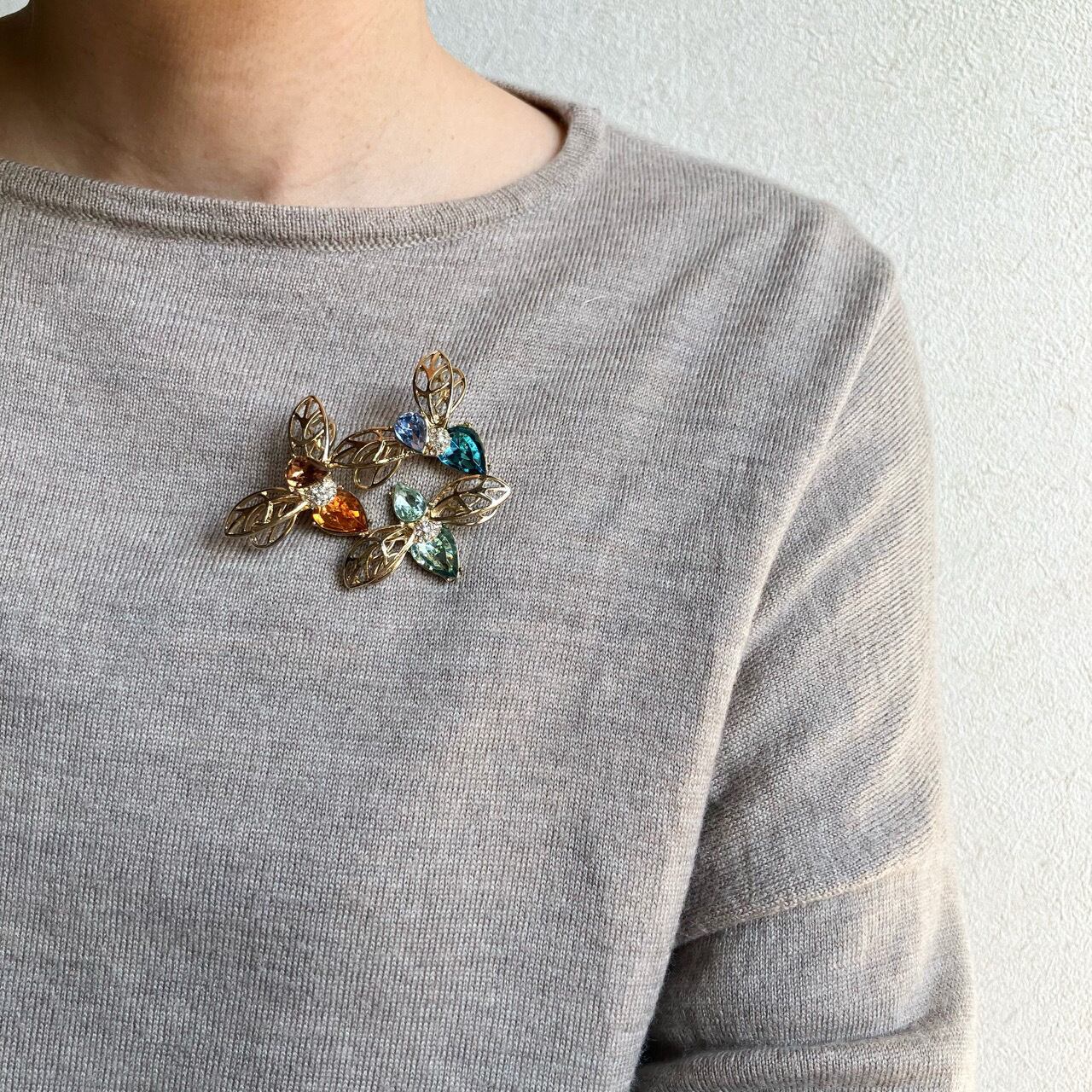 ゴールドメタルに、アンバー、ブルー、グリーン系のドロップ型ラインストーンと小粒のラインストーンで3匹のハチがデザインされた、とてもユニークで素敵なヴィンテージブローチです。