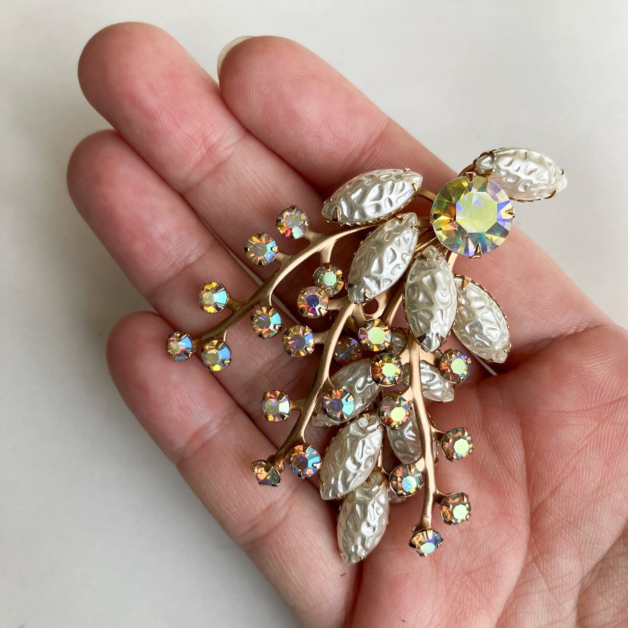 ゴールドメタルの土台に、加工されたパールカボションとオーロララインストーンで立体的に美しくデザインされた、とても素敵なヴィンテージブローチです。