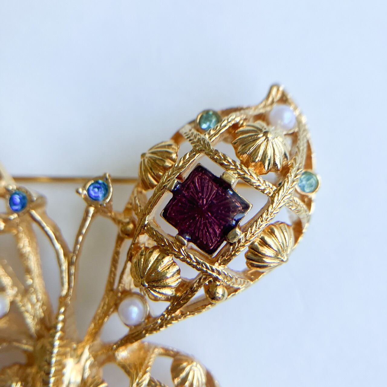 ゴールドメタルにブルーラインストーンとパールビーズ、パープルエナメルスクエアの美しい蝶々のデザインが、とても素敵な”AVON”(エイボン)のヴィンテージブローチです。