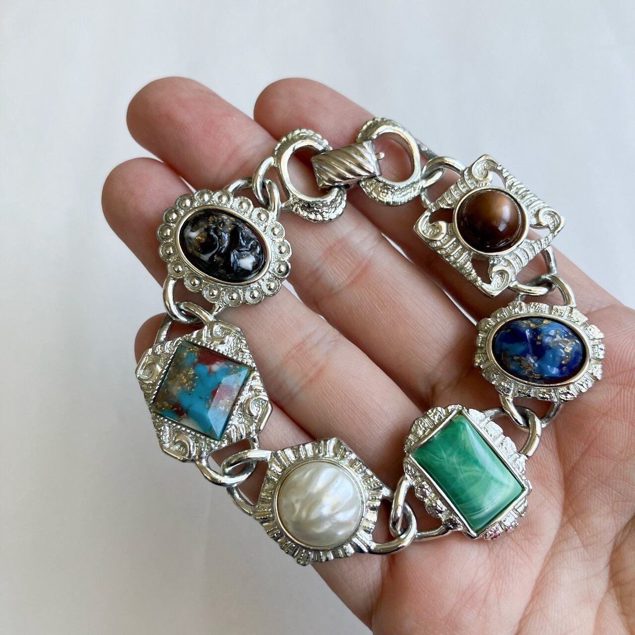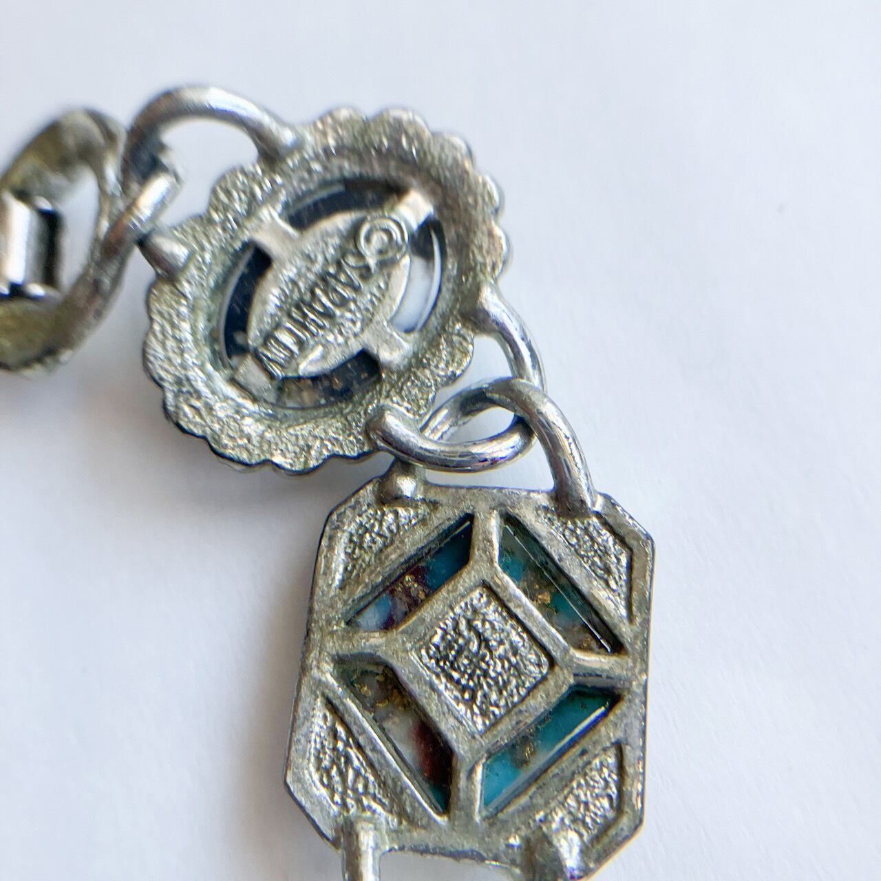 1949年に設立されたジュエリーメーカー”Sarah Coventry”(サラコベントリー )の、明るいシルバーメタルの装飾的な土台に、色々な色や形の美しいカボションがセットされたデザインが、とても素敵なヴィンテージブレスレットです。