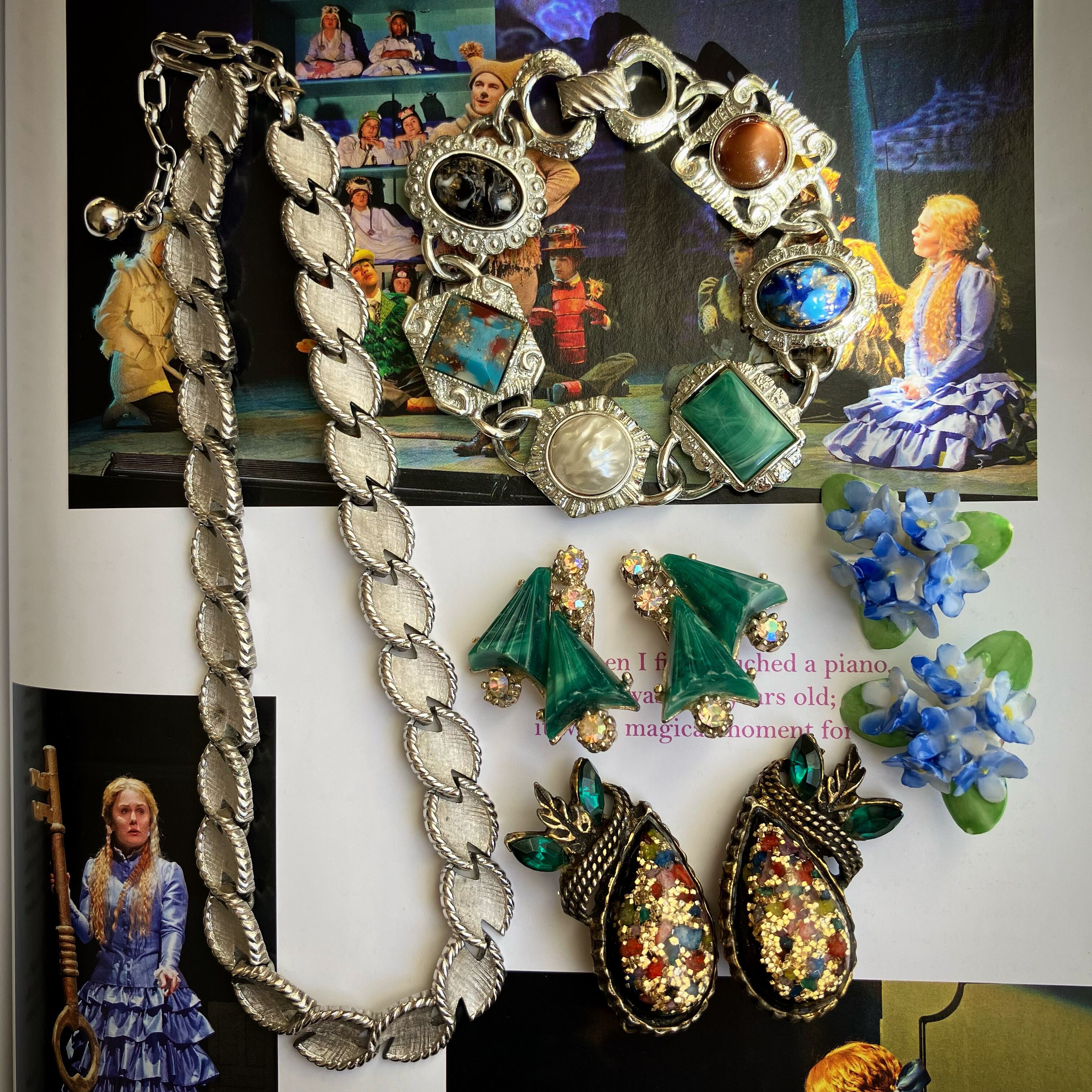 ゴールドメタルの土台に、落ち着いたグリーンマーブルのユニークな三角プラスティックパーツとオーロララインストーンで、美しくデザインされた、とても素敵なヴィンテージイヤリングです。