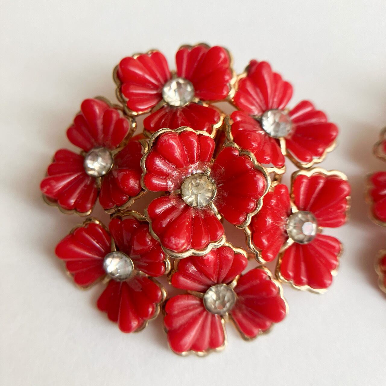 落ち着いたレッドにクリアラインストーンの、7つの小さなお花が集まって美しくデザインされた、とても素敵なヴィンテージイヤリングです。