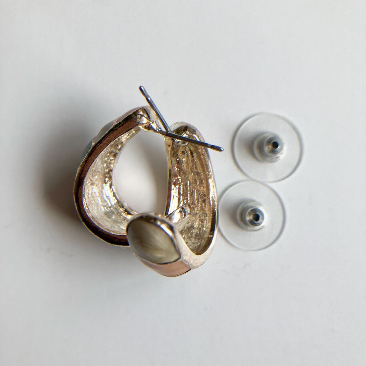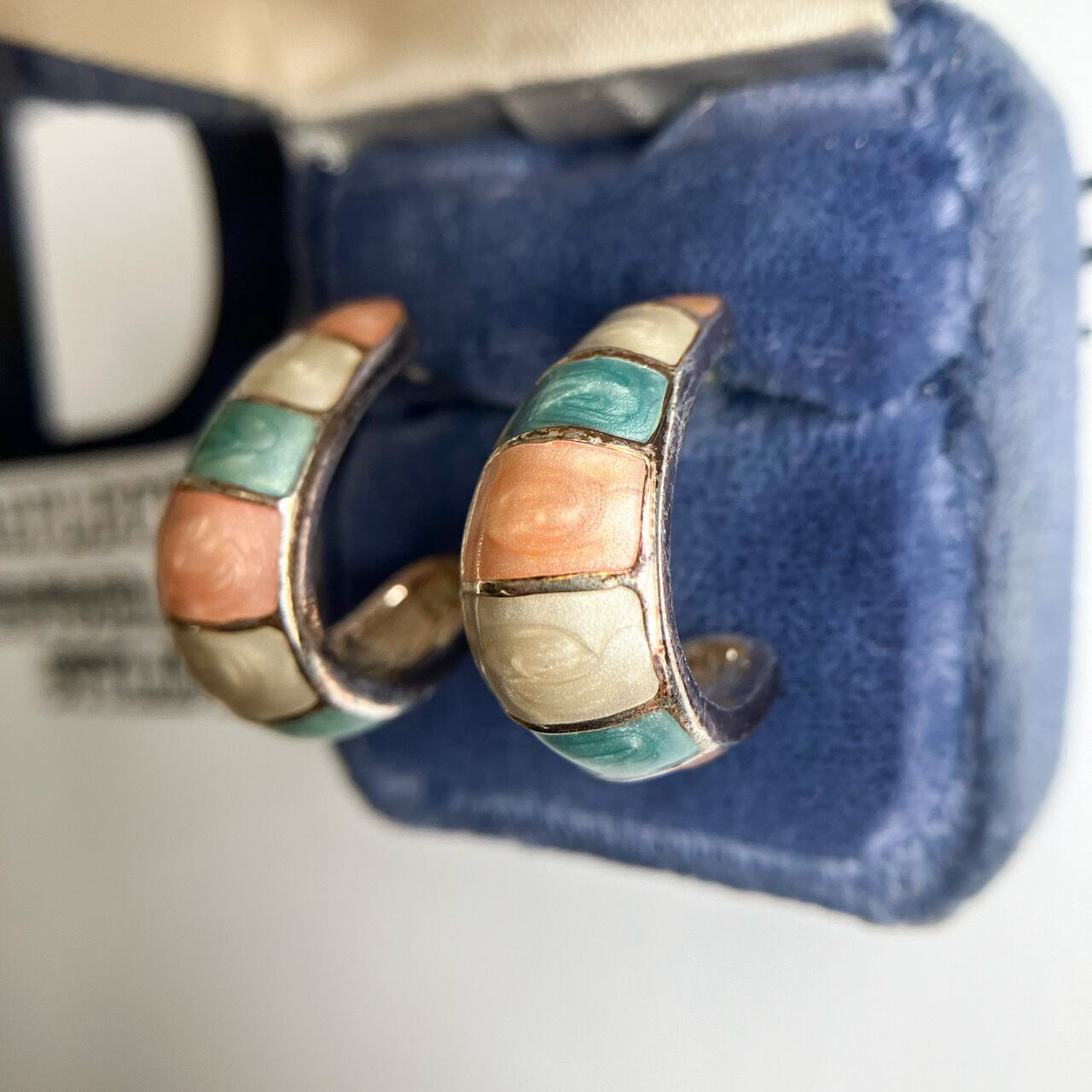 シルバーメタルの土台に、淡いブルーグリーン、ベージュ、オレンジピンク系の、優しいパステルマーブルエナメルでフープ型にデザインされた、さりげない存在感がとても素敵なヴィンテージピアスです。