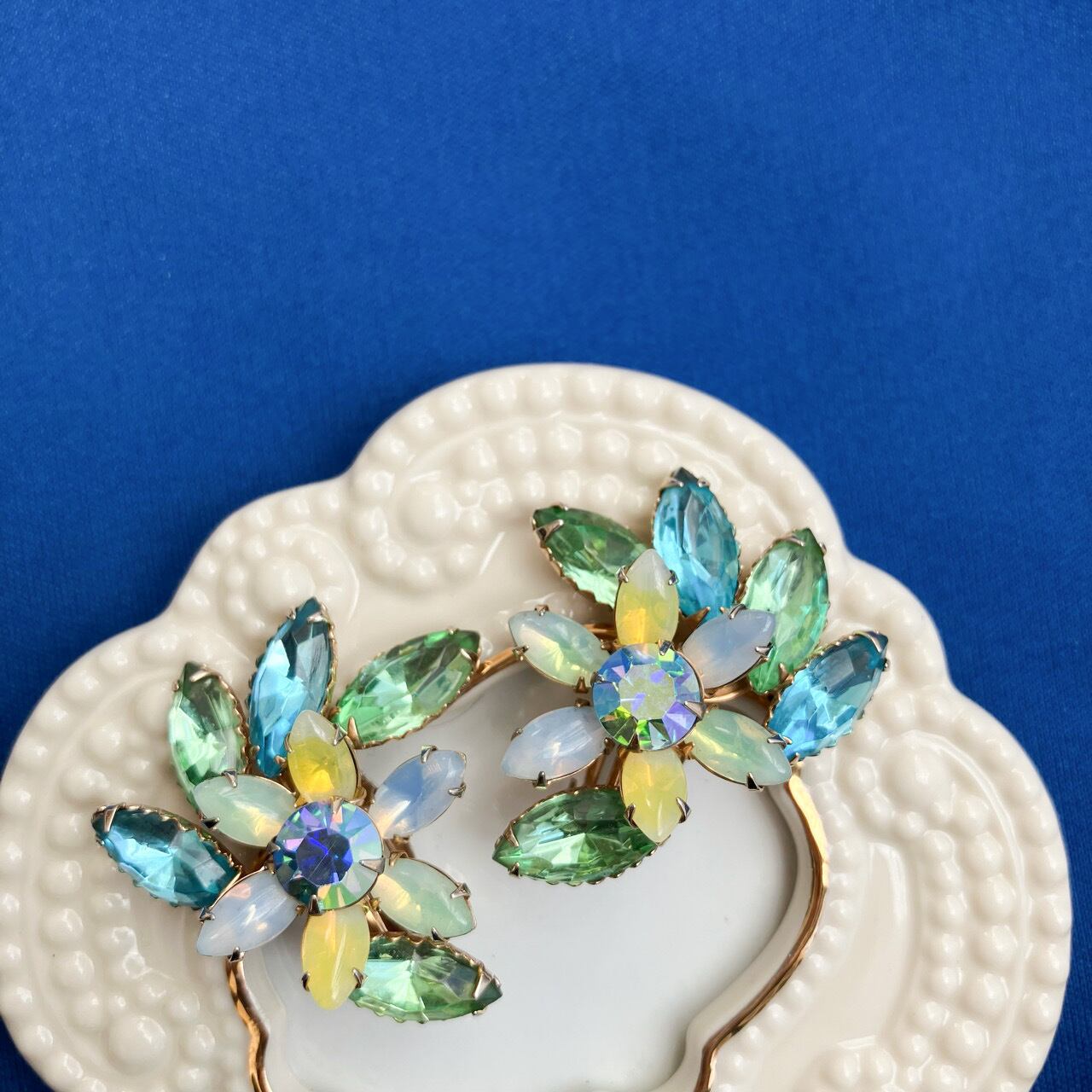 ゴールドメタルの土台に、ブルー、グリーン、イエロー系の半透明やクリアのラインストーンで美しく立体的にデザインされた、とてもスペシャルで素敵なヴィンテージイヤリングです。