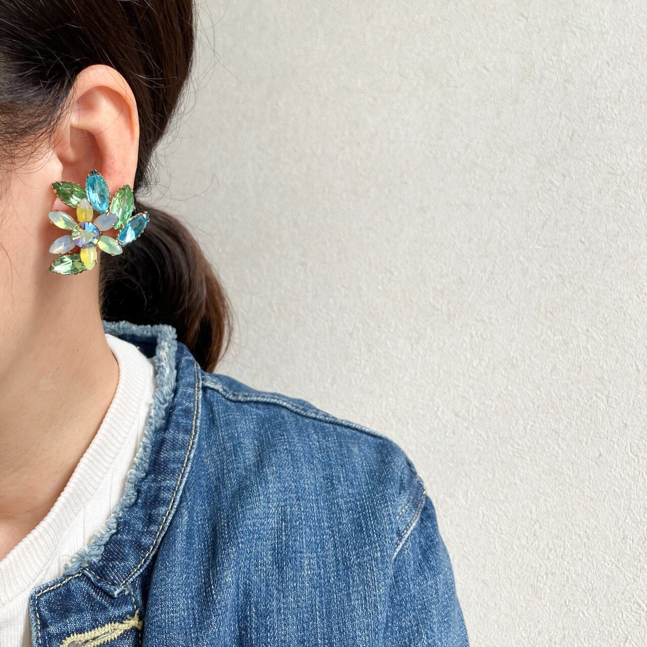 blue green yellow rhinestone flower earring[e-1969] ヴィンテージイヤリング