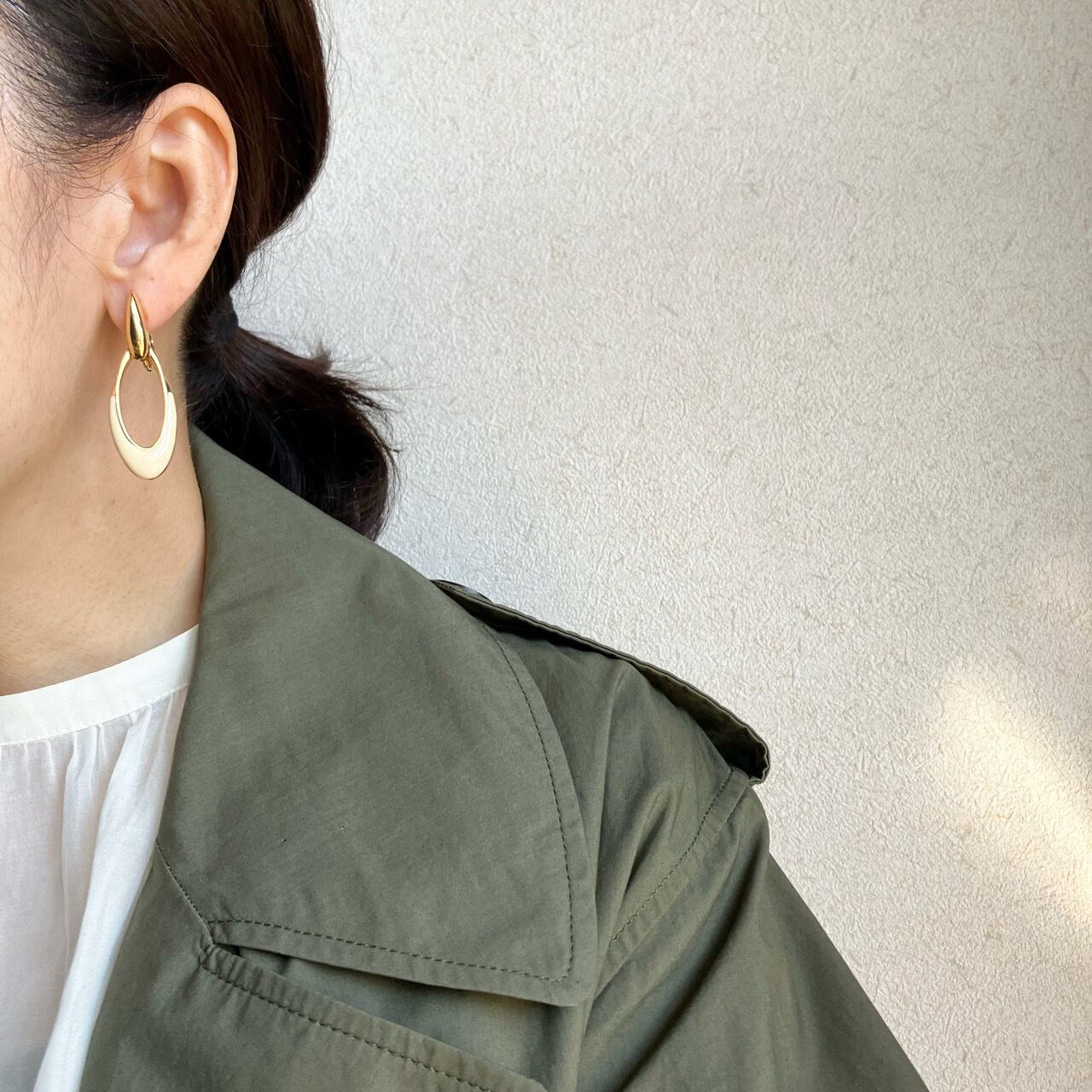 1910年に設立され、ハリウッドやブロードウェイのジュエリーも制作していたジュエリーメーカー"Trifari"(トリファリ)の、ゴールドメタルのシャープなトップに、クリームエナメルのオーバルパーツが揺れるデザインが、とても素敵なヴィンテージイヤリングです。