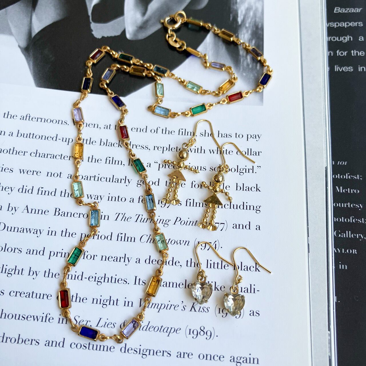 ボールチェーンの手足の女の子のようなモチーフと、立体的なハート型のクリアラインストーンの揺れるデザインがとても素敵な、80年代のユニークなパーツを使用した小さめサイズのヴィンテージピアス2点セットです。