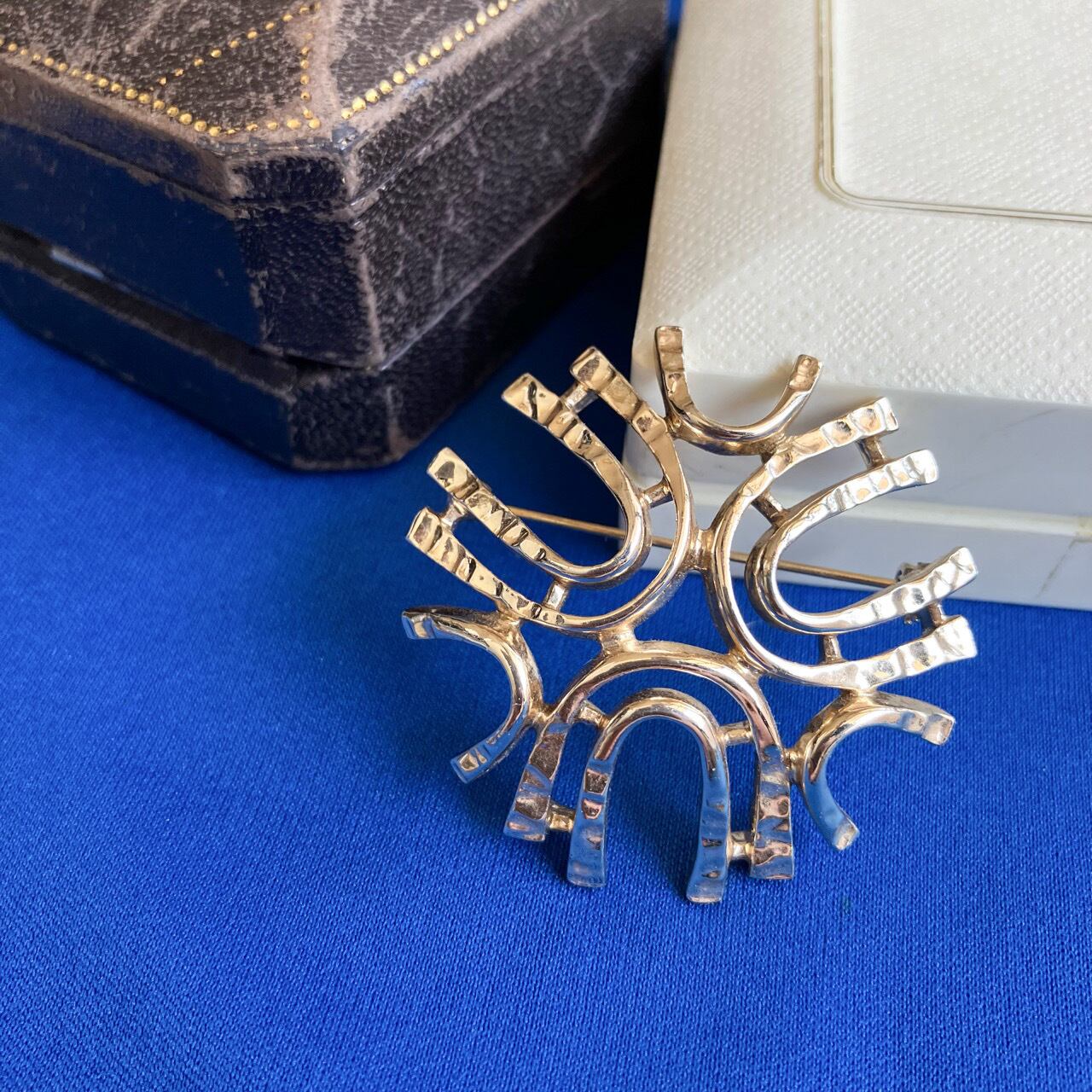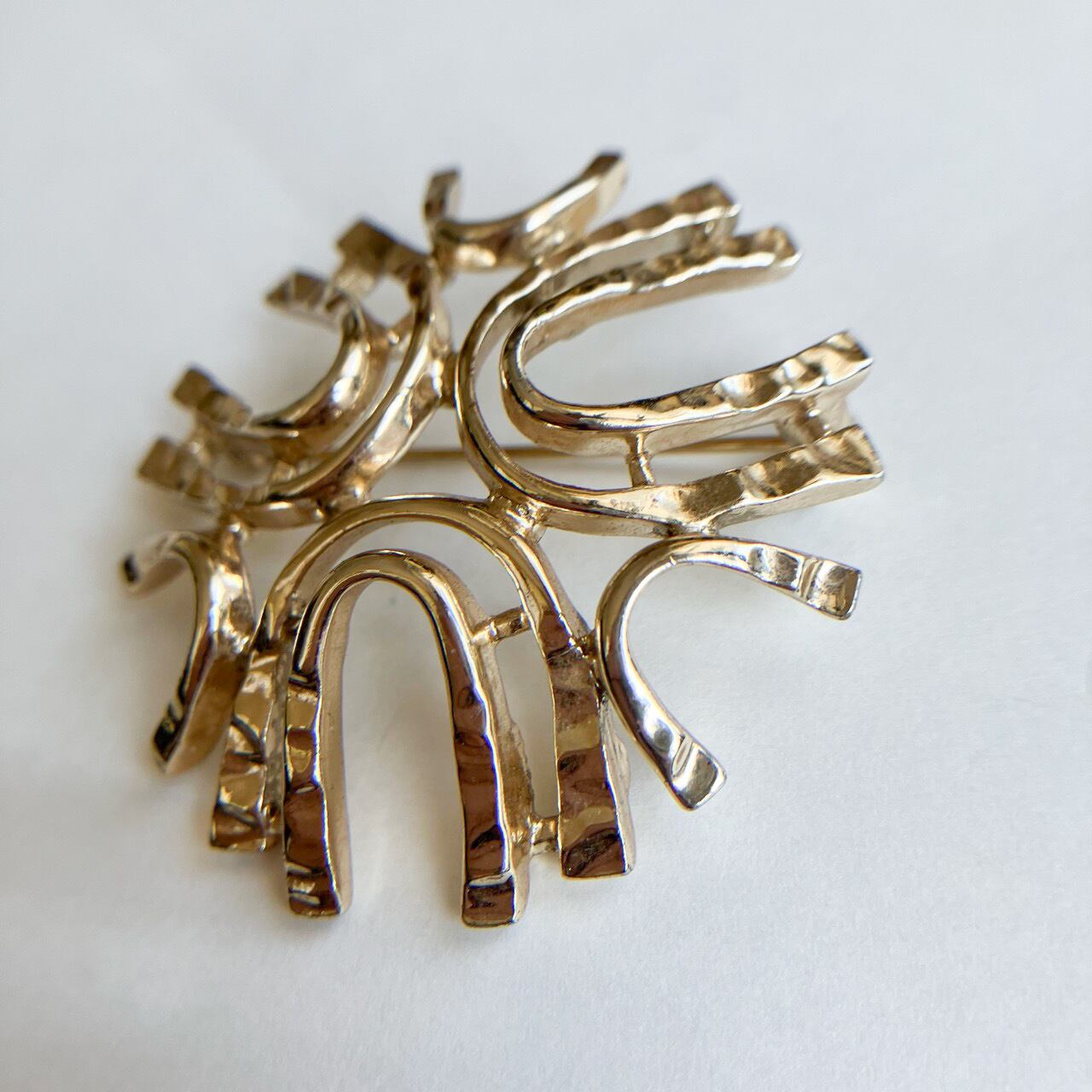 1949年に設立されたジュエリーメーカー”Sarah Coventry”(サラコベントリー)の、ゴールドメタルのオブジェのようなモダンなデザインがとても素敵なヴィンテージブローチです。