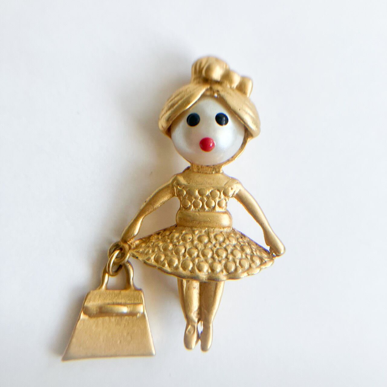 マットなゴールドメタルとパールカボションでデザインされた、バッグを持ってお出かけするお洒落な女の子のデザインが、とても素敵なヴィンテージブローチです。