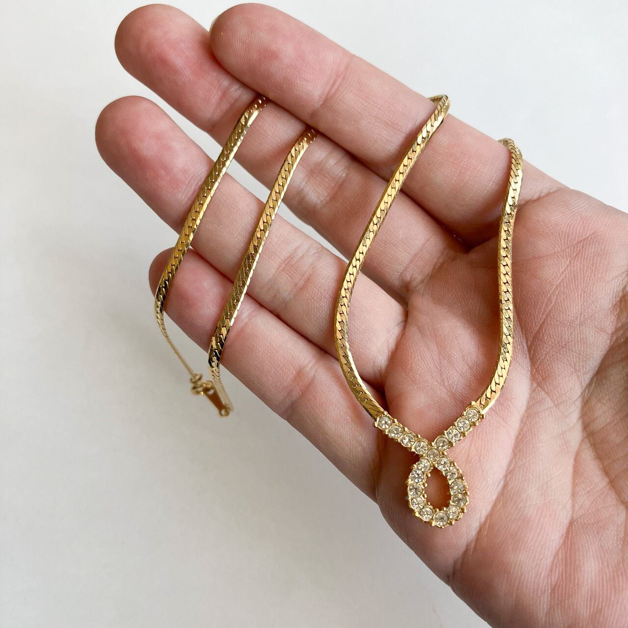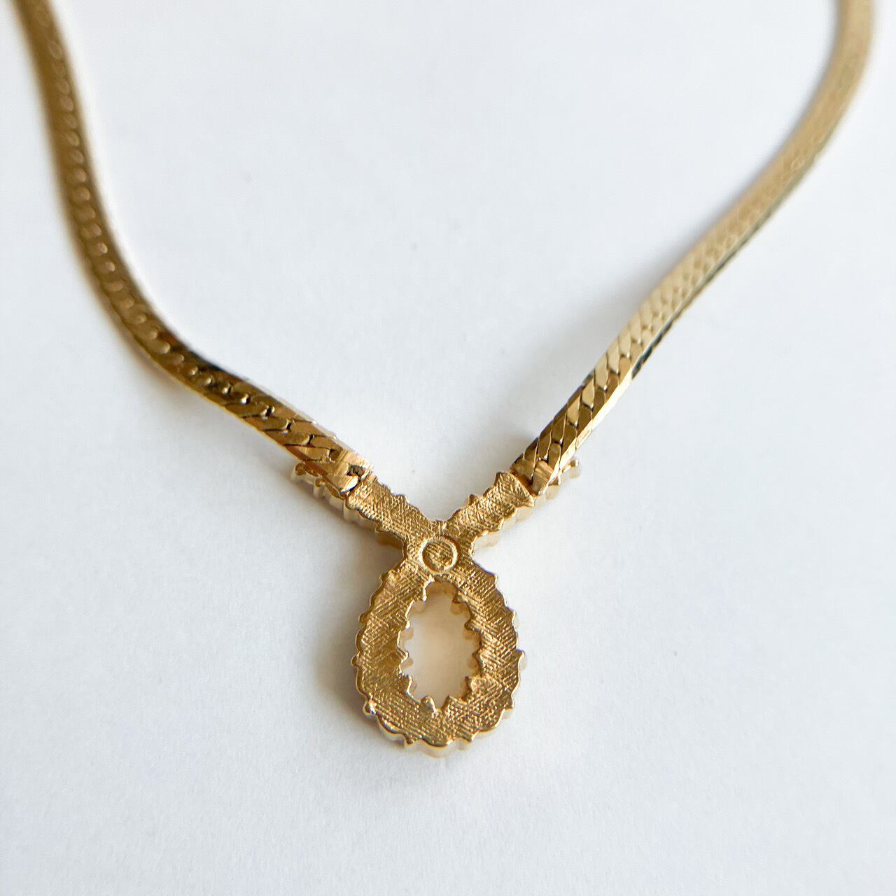 ゴールドメタルのフラットチェーンにラインストーンドロップがアクセントになった、洗練されたお洒落なデザインが、とても素敵な”AVON”(エイボン)のヴィンテージネックレスです。