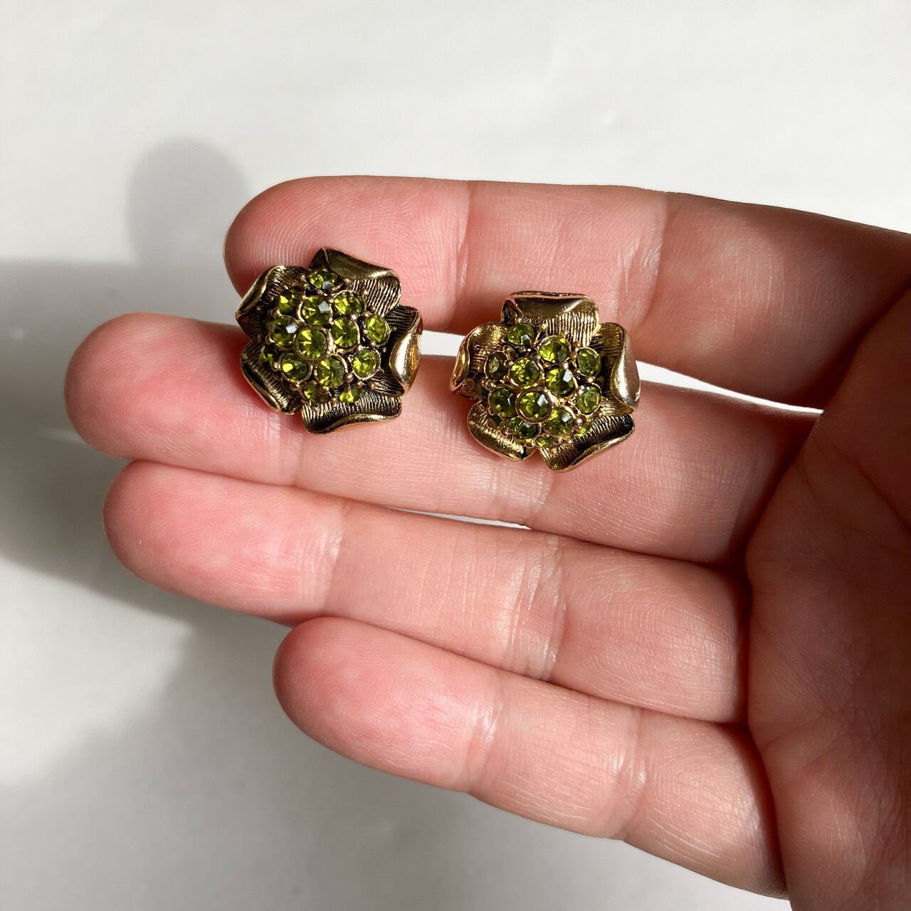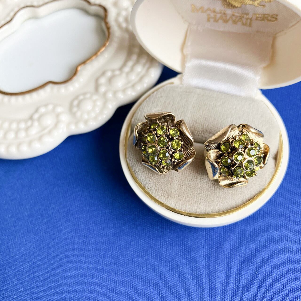 アンティーク調ゴールドメタルの花びらに、立体的にセットされた落ち着いたライトグリーンラインストーンのフラワーデザインが、とても素敵なヴィンテージイヤリングです。