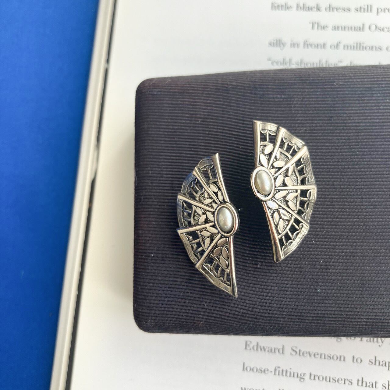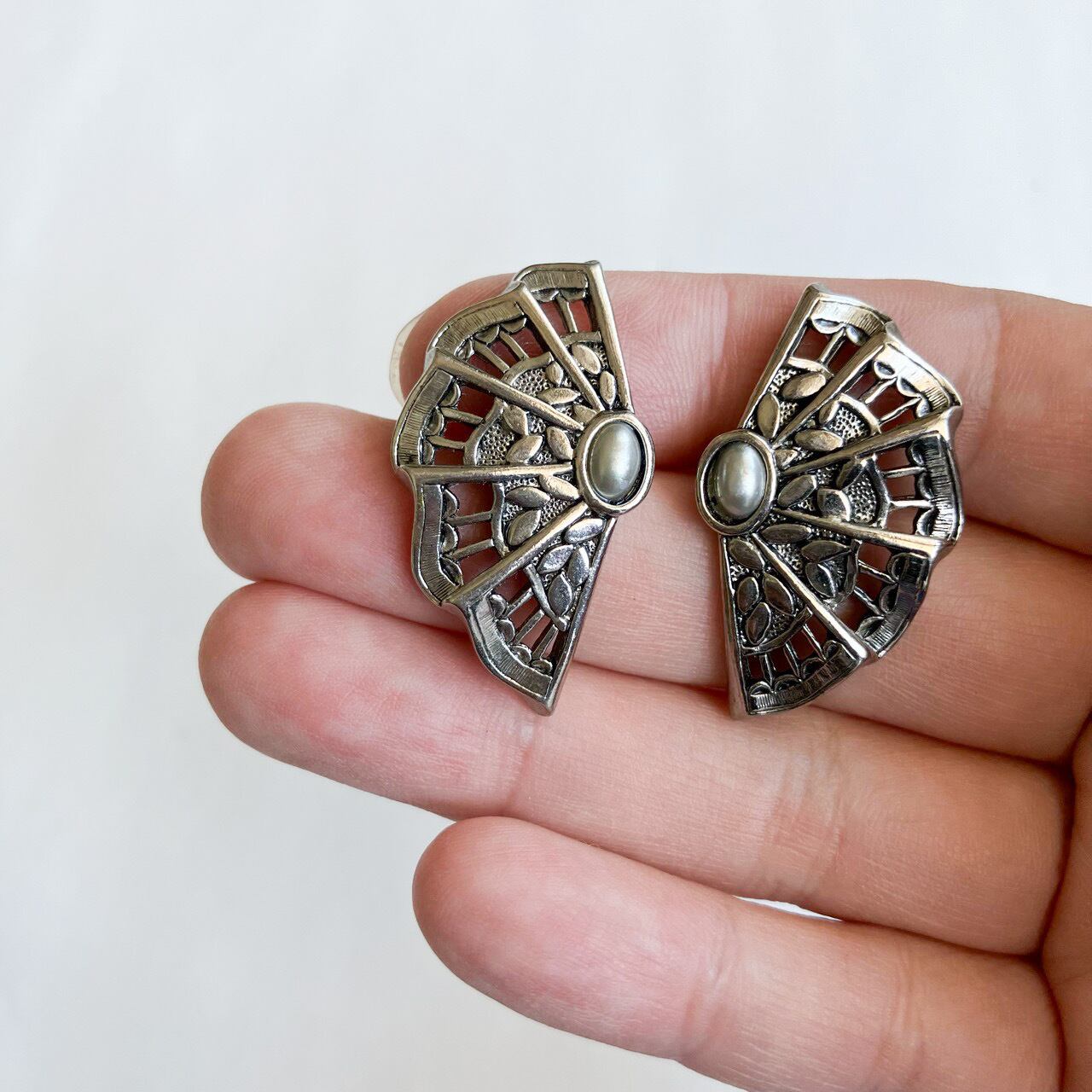 アンティーク調シルバーメタルにシルバーグレー系のパールカボションがセットされた、細やかな柄やラッフルのレースのような美しくお洒落なデザインが、とても素敵な”AVON”(エイボン)のヴィンテージピアスです。
