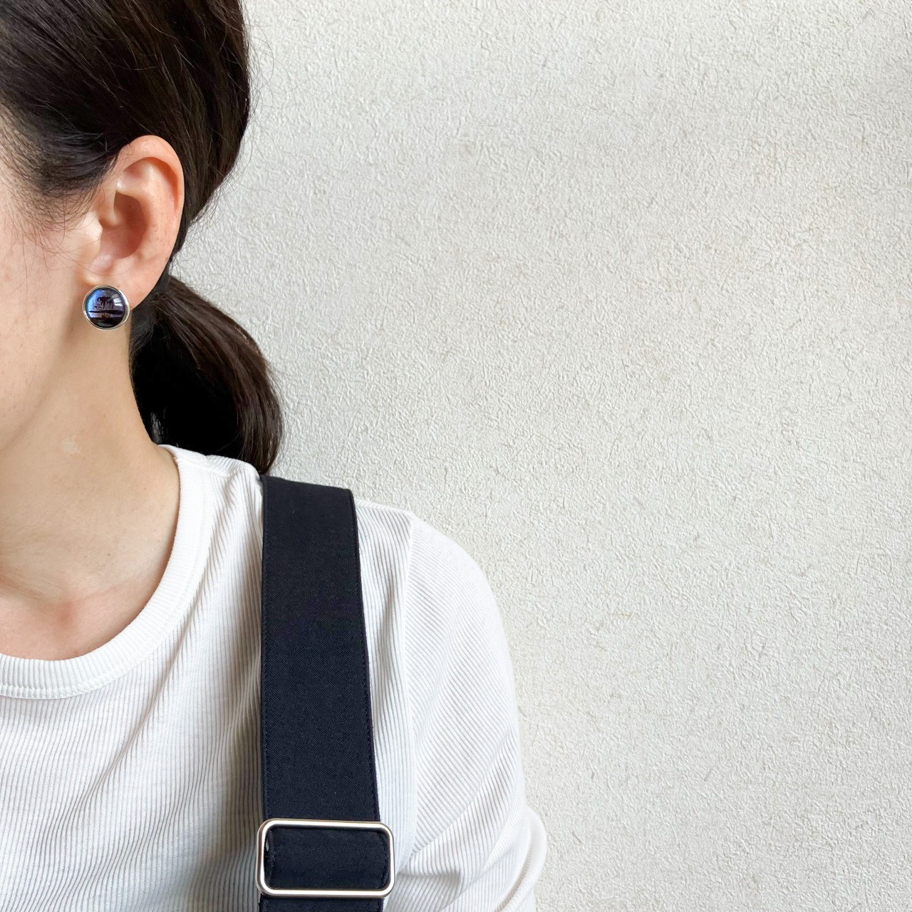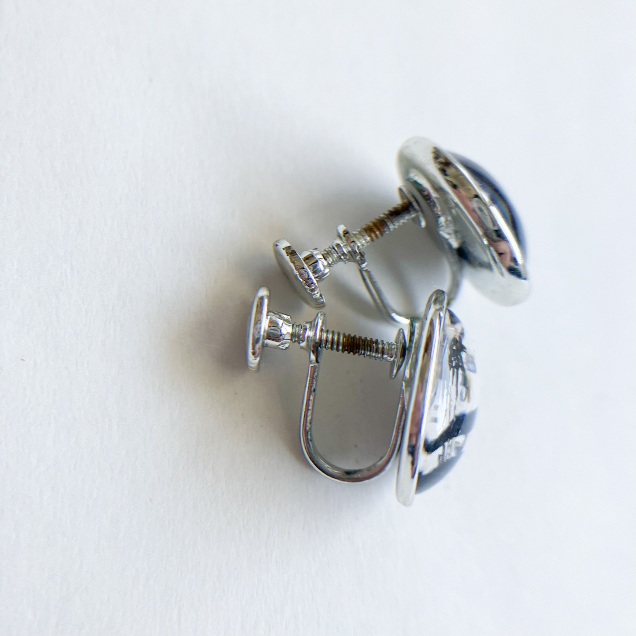 シルバーメタルの丸い土台に、モルフォ蝶の羽の上に南国調のアートペイントされたデザインが、とてもユニークで素敵なヴィンテージイヤリングです。
