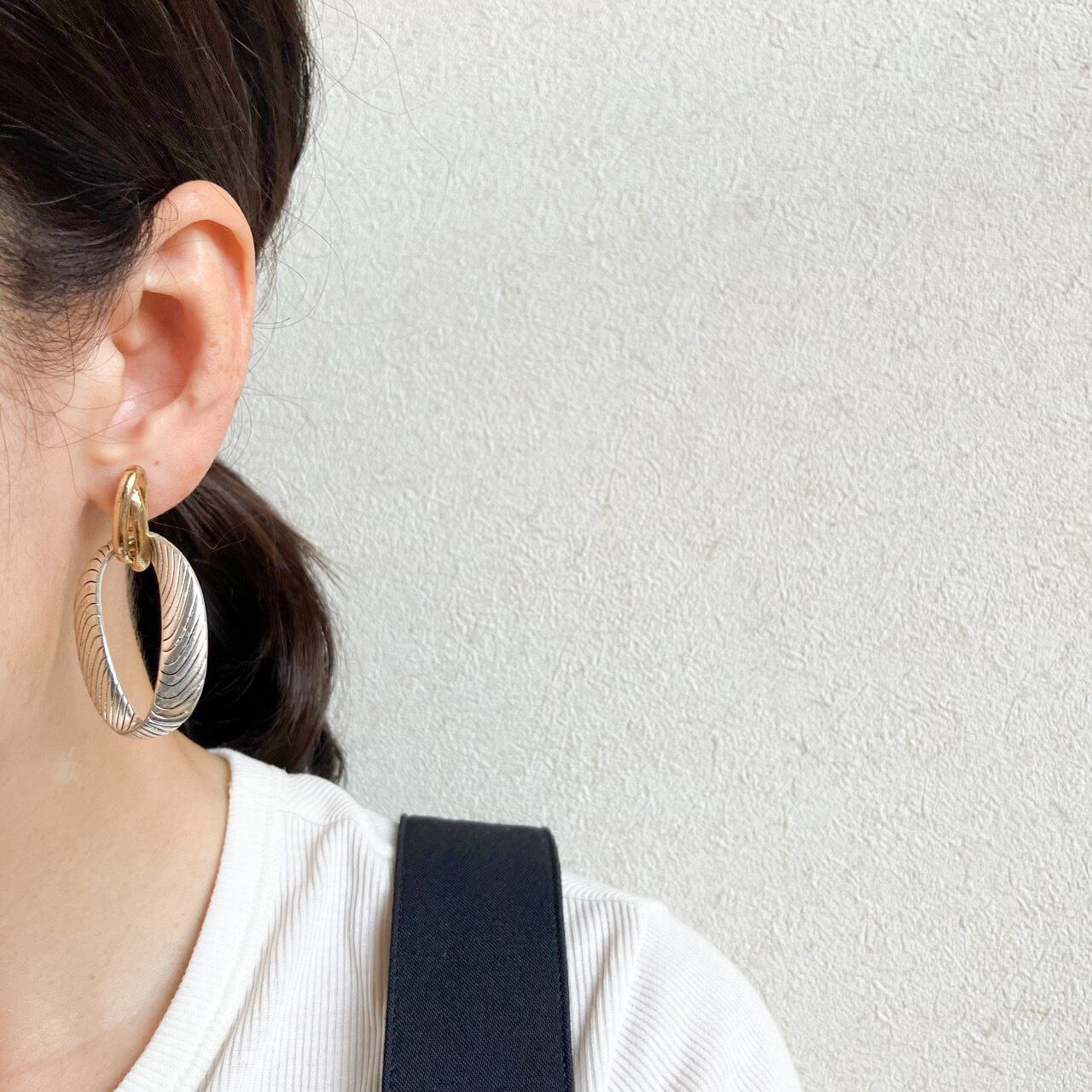 ゴールドメタルの縦長フープのトップに、シルバーメタルの加工されたリングのようなパーツが揺れる存在感のあるデザインが、とても素敵なヴィンテージイヤリングです。