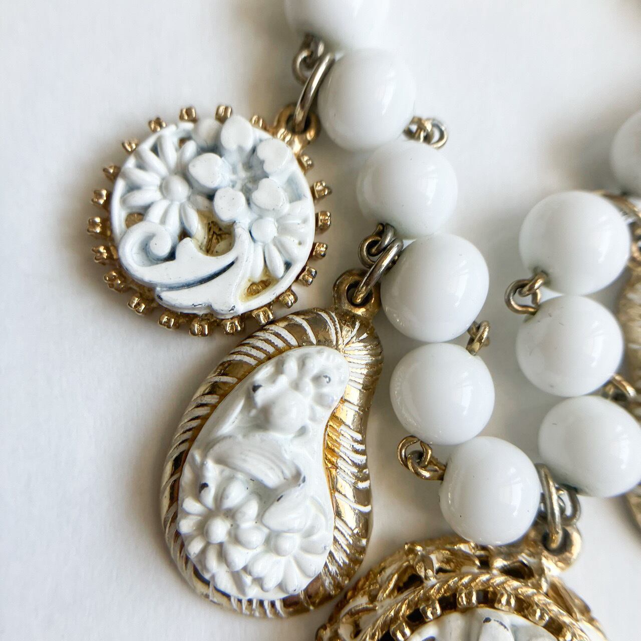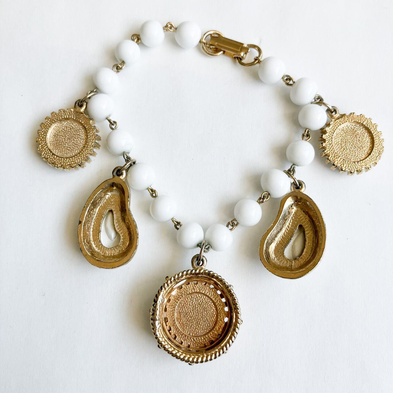 ホワイトビーズ、ゴールドメタルにホワイトペイントのフラワーモチーフチャームが揺れるスペシャルなデザインが、とても素敵なヴィンテージブレスレットです。