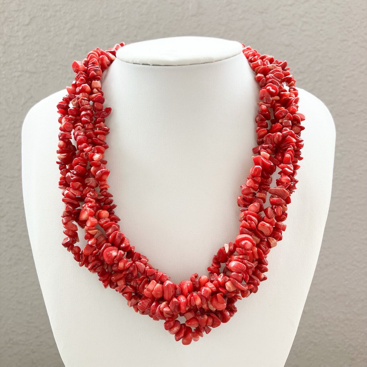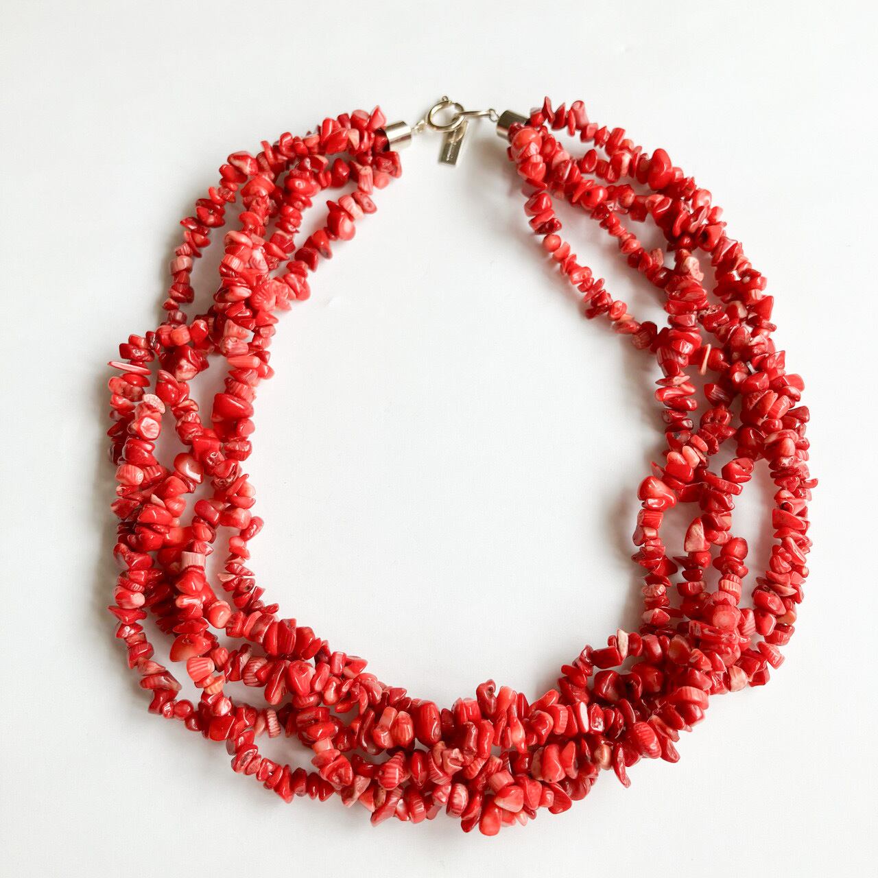 ナチュラルな赤珊瑚のビーズがふんだんに使われ編まれたような存在感のあるデザインが、お洒落で素敵な"JUNKO SHIMADA"のネックレスです。