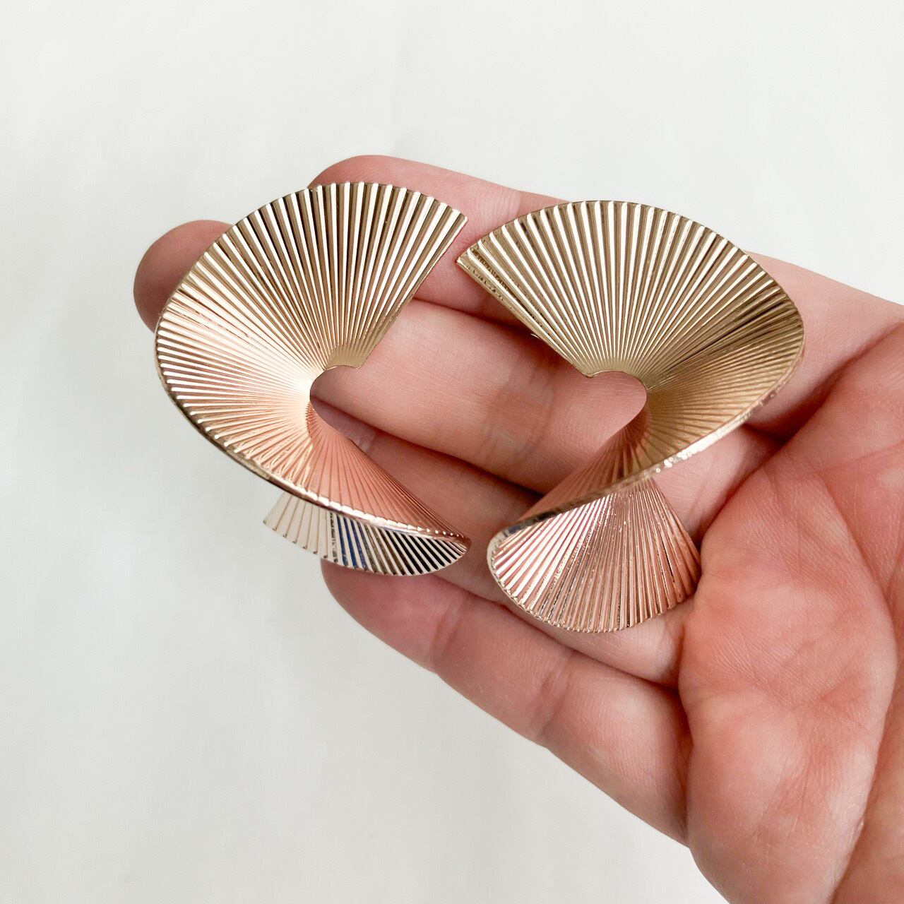 明るいゴールドメタルの立体的で大きなスパイラルデザインが、個性的で存在感のあるとても素敵なヴィンテージピアスです。