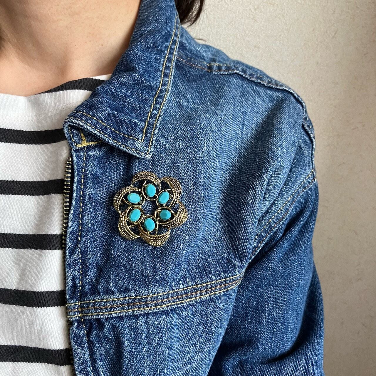 アンティーク調の渋みのあるゴールドメタルの土台に、ターコイズパーツがセットされたお洒落なデザインが、とても素敵なヴィンテージブローチです。