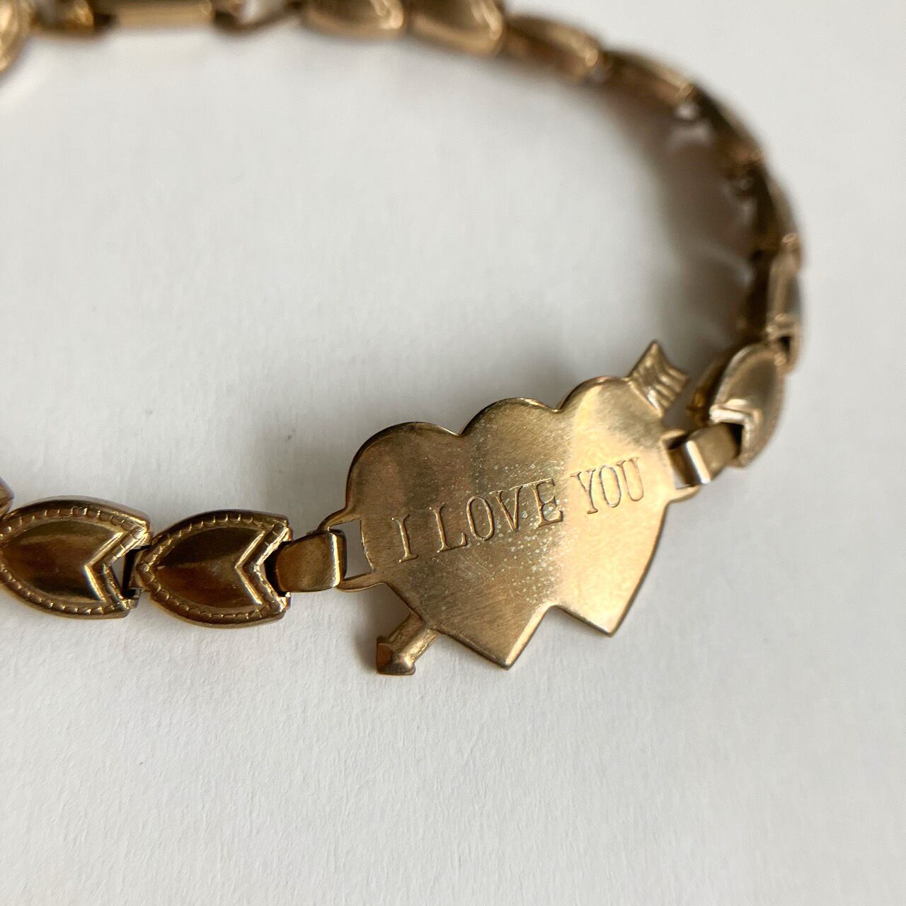 ヴィンテージらしいブロンズ寄りの落ち着いたゴールドメタルの、“I LOVE YOU”の文字が入ったハートに矢が刺さったようなデザインが珍しくとても素敵なヴィンテージブレスレットです。