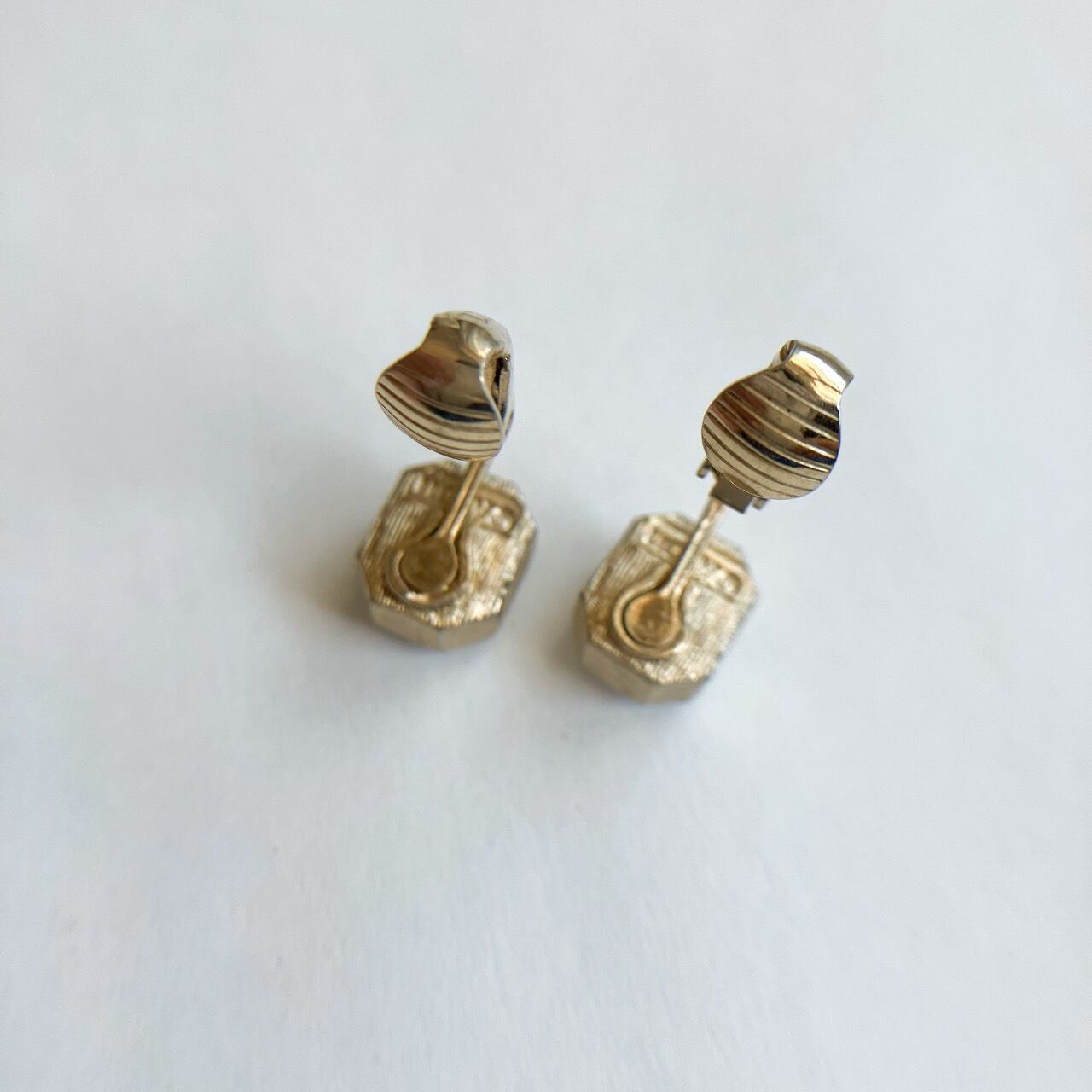 ゴールドメタルの立体的な長方形の土台に、美しいオーロラの輝きがあるラインストーンがセットされた、とても素敵な”AVON”(エイボン)のヴィンテージイヤリングです。