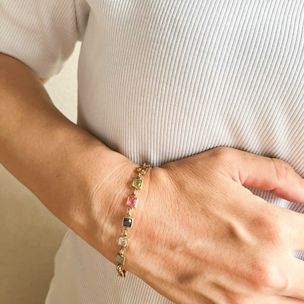 落ち着いたゴールド色のスクエア型の土台に、パステルカラーのダイヤカットのラインストーンセットされた、さりげなく華やかで、とても素敵なヴィンテージブレスレットです。