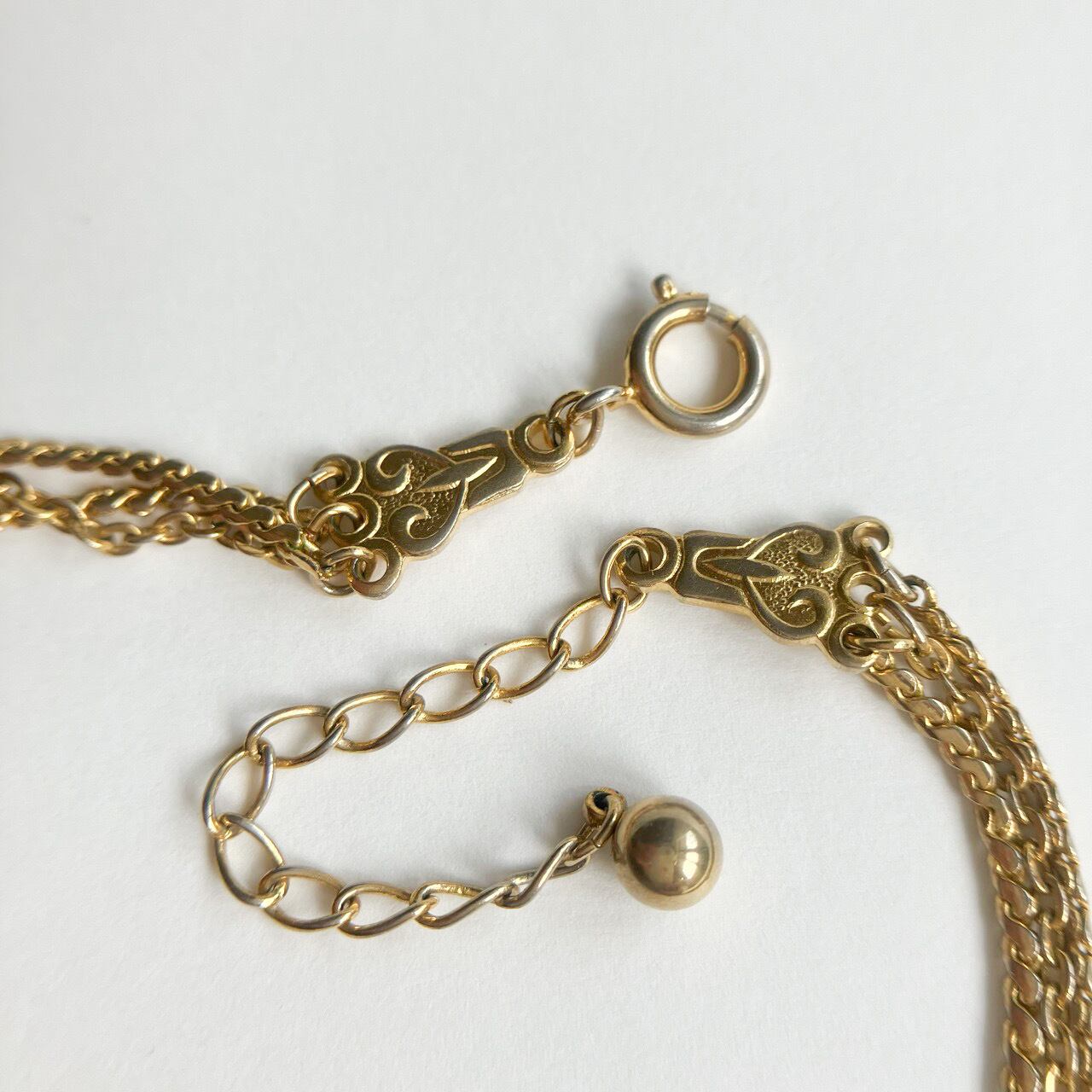 落ち着いたゴールドメタルのシャープなチェーンと、デザインされたチェーンで三連になった、とても素敵なヴィンテージネックレスです。