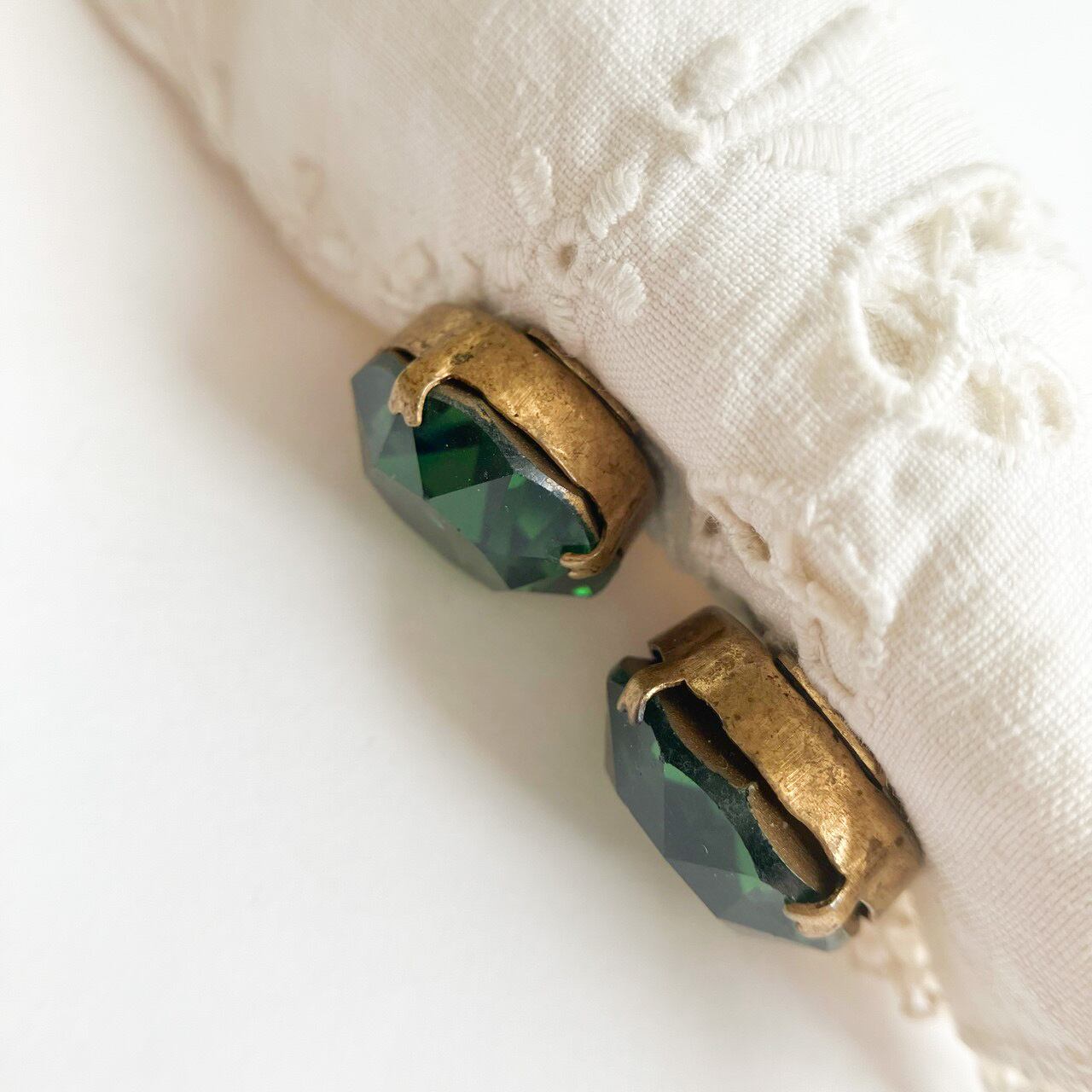 アンティーク調ゴールドメタルの土台に、深みのあるグリーンの大粒のラインストーンがセットされたデザインが、とても素敵なヴィンテージイヤリングです。